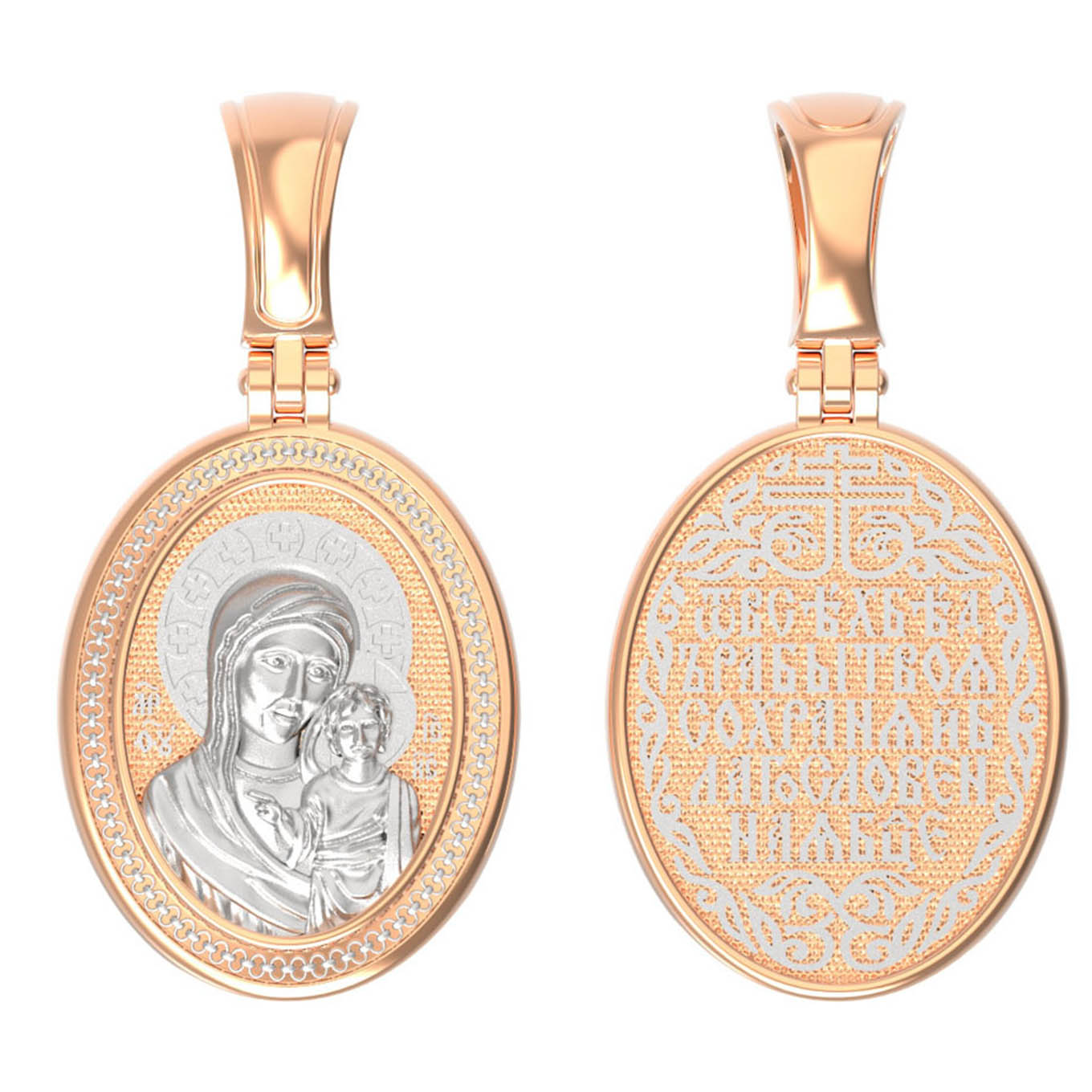 На лицевой части образка изображена Казанская икона Божией Матери — одна из самых почитаемых в России чудотворных икон Богородицы. Богословское значение Казанской иконы — указать верующим истинный Путь к спасению, который лежит через Христа. Только Божия Матерь имеет настолько сильное дерзновение к Спасителю, что может ходатайствовать перед Ним за всех верных. Именно этот образ дарится новой повенчанной паре, как хранитель очага и семейная реликвия. Молитва перед Казанской иконой Божьей Матери помогает во всех сложных случаях жизни, в болезнях, во всех печалях, невзгодах, скорбях. Уникальная история появления, чудеса, случившиеся по молитвам православных людей возле образа — все это делает Казанскую Богородицу особенной, среди тысяч других икон.
