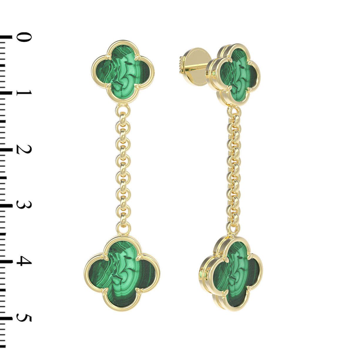 Серьги имеют продуманную конструкцию: в их оформлении использованы 4 вставки, что создает гармоничный и завершенный вид. Тонкая, изящная цепочка придает украшению динамику и легкость при каждом движении. Лимонный оттенок золотого металла прекрасно сочетается с ярким зеленым цветом малахита, создавая стильный контраст.