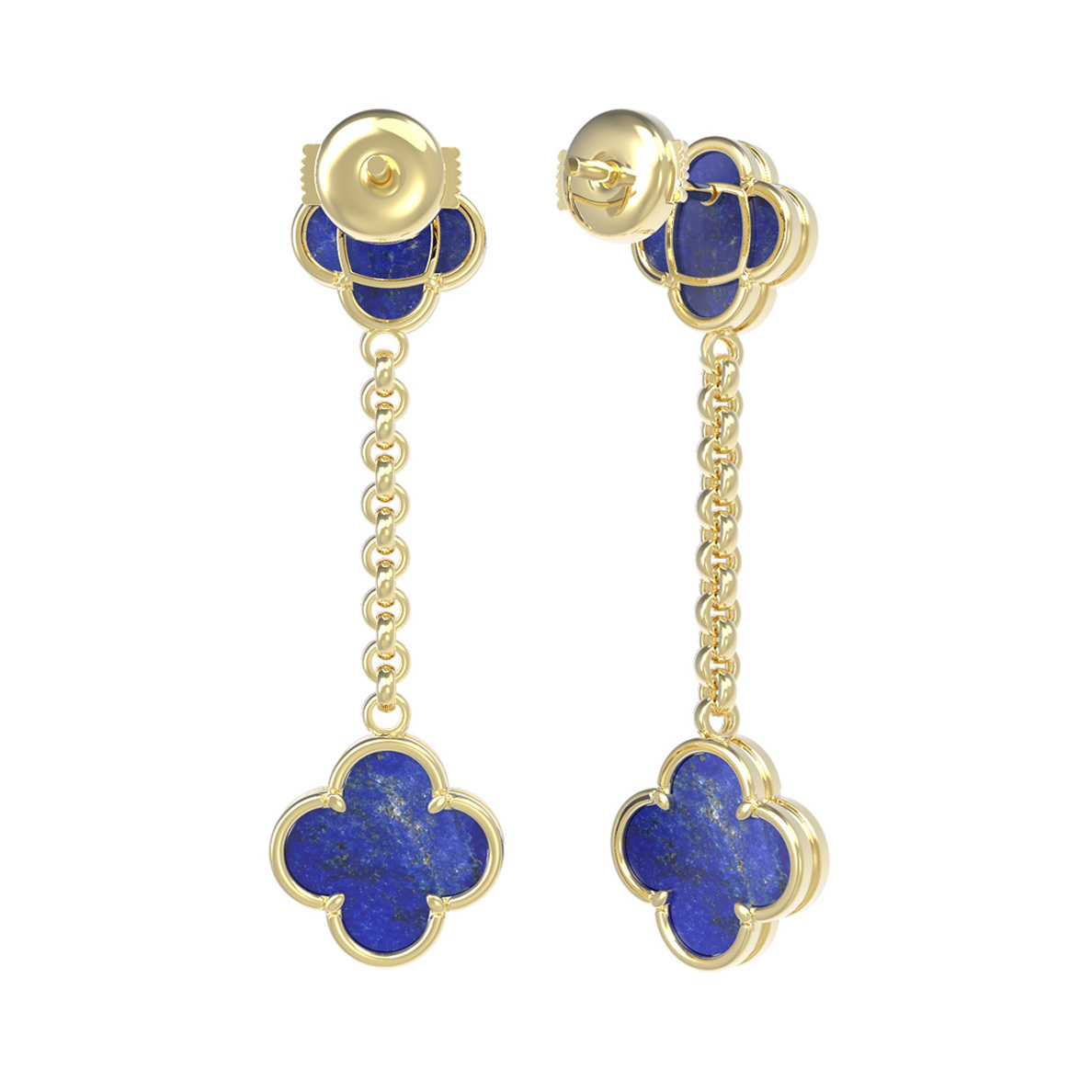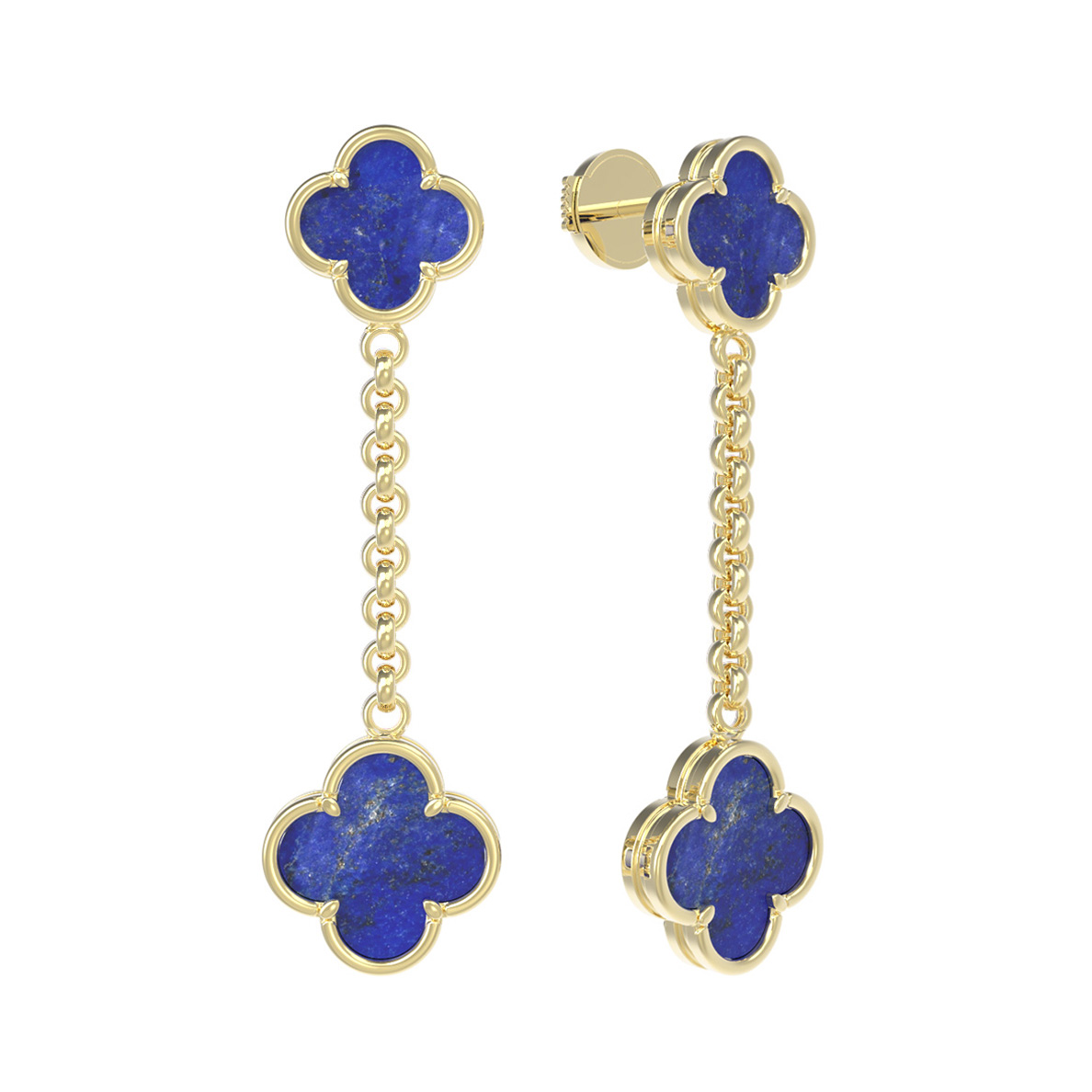 Конструкция серег представляет собой изящную подвесную композицию, где элементы в форме клевера соединены тонкой цепочкой. Подвижная часть изделия придает украшению легкость и динамичность, заставляя его мягко покачиваться при каждом движении. Глубокий синий оттенок лазурита в обрамлении теплого лимонного металла выглядит благородно и статусно.