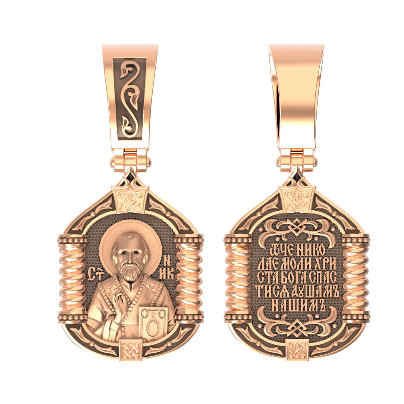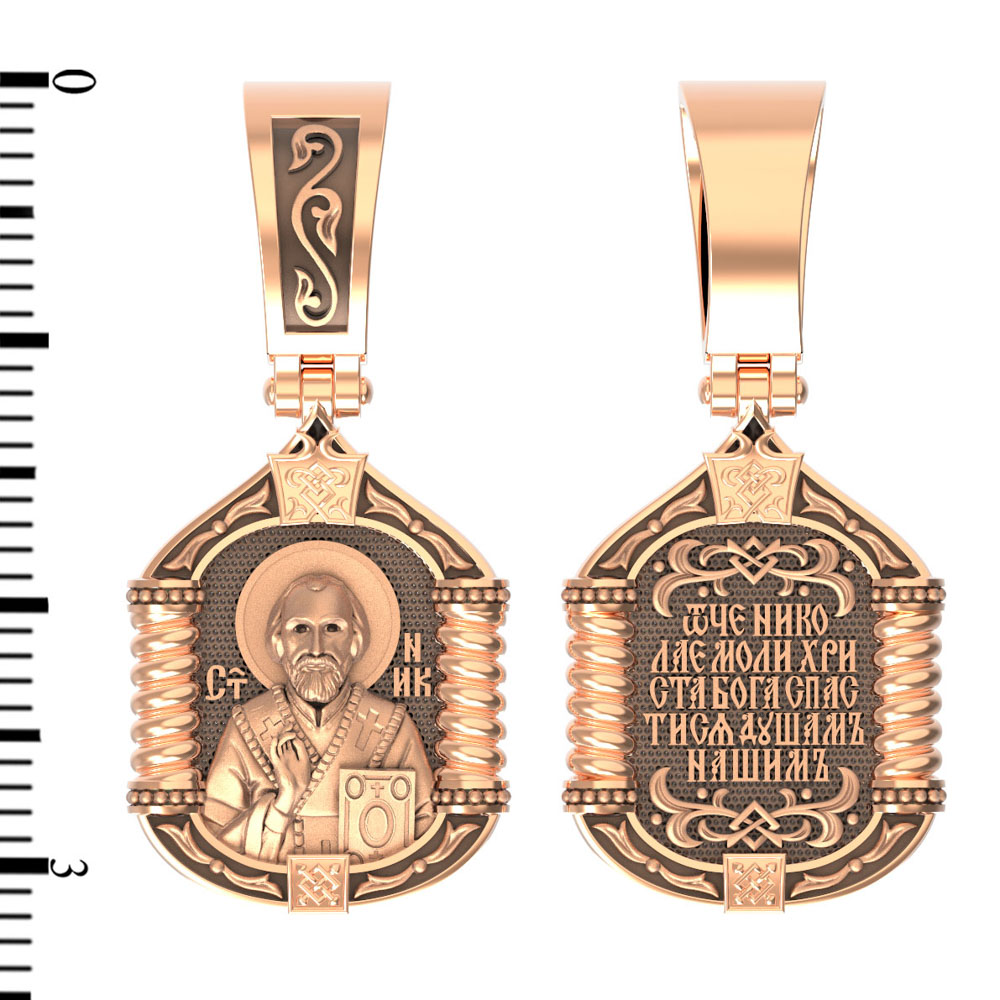 На лицевой стороне образка изображен Святитель Николай архиепископ Мир Ликийских, Чудотворец. Он является одним из самых почитаемых святых в православном мире. Святитель Николай родился во второй половине III века в Малой Азии в Ликийском городе Патары. С рождения Божий Угодник проявлял необыкновенные дарования. Сохранилось Предание, что во время крещения он, никем не поддерживаемый, простоял в купели три часа. Приняв сан священника, святитель Николай стал проводить еще более строгую подвижническую жизнь. Избранник Божий Николай стал вершиной всех добродетелей, поднятой до райской высоты. С кем из величайших праведников не сравнялся он образом духовной красоты, кому из них не последовал в своих деяниях и чудотворениях? Вся жизнь святого Николая — это служение Богу. Много великих и преславных чудес сотворил великий Святитель Николай Угодник. Он помогал сущим в бедах, укрощал штормы, спасал от потопления и выносил на сушу из глубины морской, освобождал из плена и приносил освобожденных домой, избавлял от уз и темницы, защищал от посечения мечом, освобождал от смерти и подавал многим различные исцеления, слепым прозрение, хромым хождение, глухим слух, немым дар слова.
