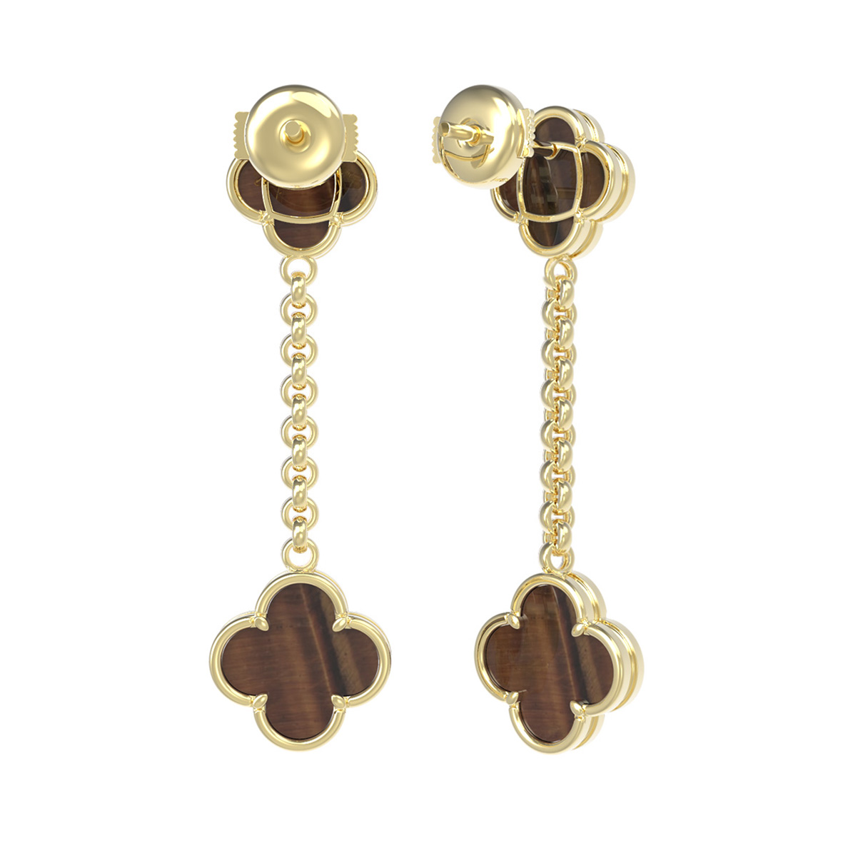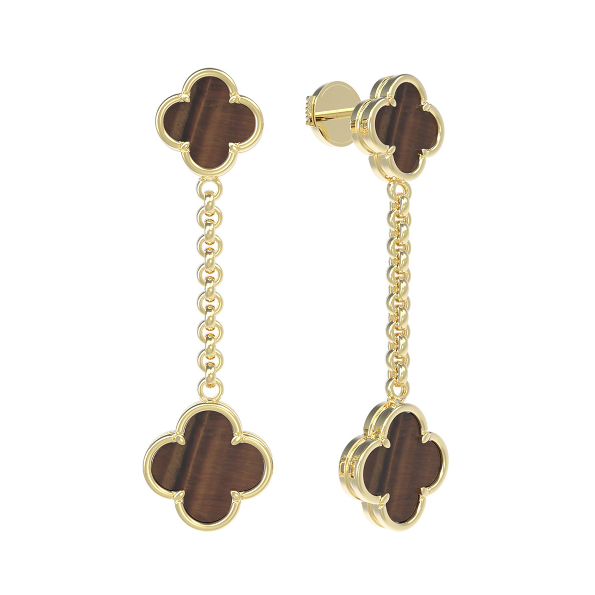 Центральным элементом дизайна является узнаваемый мотив клевера, который привносит в образ нотки природной эстетики и символизма. Вставки из натурального тигрового глаза оранжевого оттенка подчеркивают изысканность работы: всего в украшении использовано 4 камня, создающих акцентную игру цвета. Благодаря удлиненной форме и подвижному соединению, серьги эффектно двигаются при ходьбе, притягивая взгляды к их владельцу.