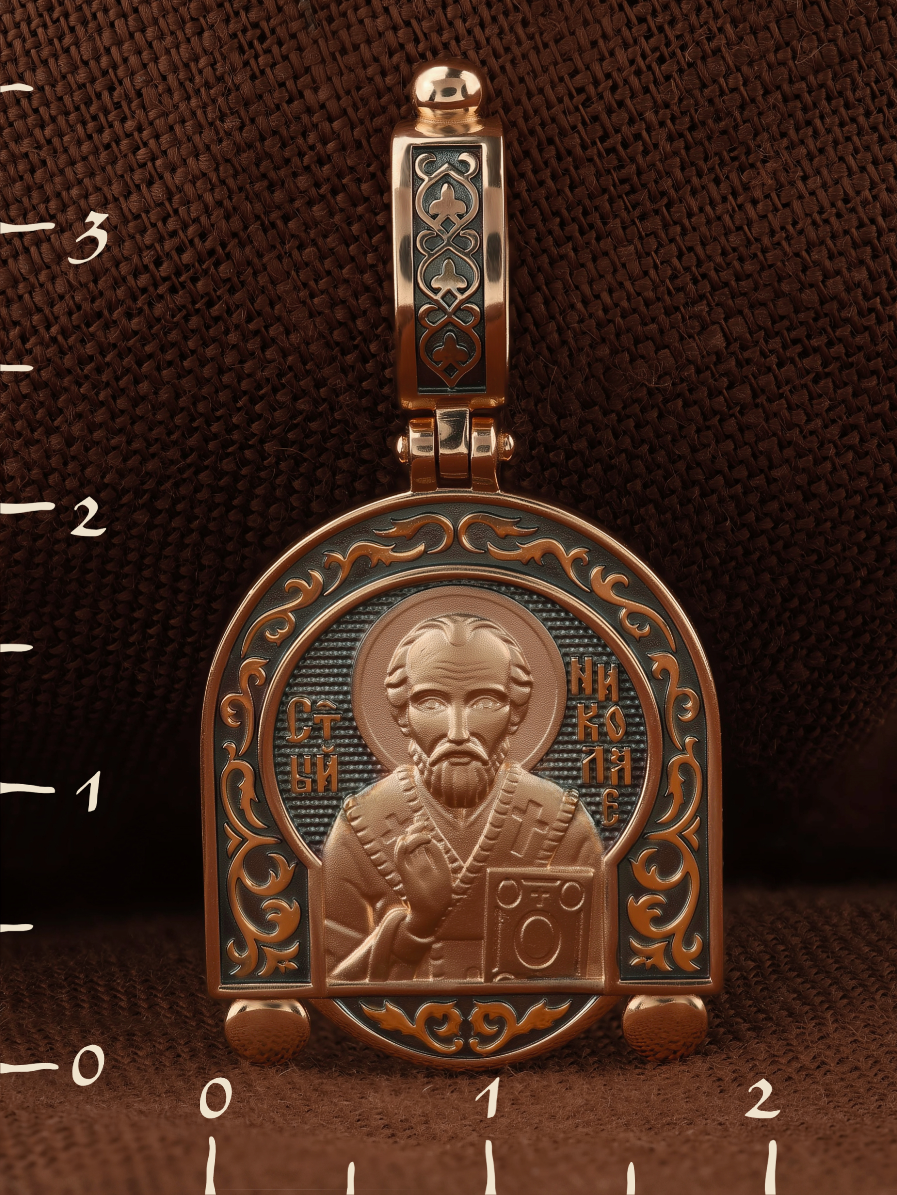 На лицевой стороне образка изображен Святитель Николай архиепископ Мир Ликийских, Чудотворец. Он является одним из самых почитаемых святых в православном мире. Святитель Николай родился во второй половине III века в Малой Азии в Ликийском городе Патары. С рождения Божий Угодник проявлял необыкновенные дарования. Сохранилось Предание, что во время крещения он, никем не поддерживаемый, простоял в купели три часа. Приняв сан священника, святитель Николай стал проводить еще более строгую подвижническую жизнь. Избранник Божий Николай стал вершиной всех добродетелей, поднятой до райской высоты. С кем из величайших праведников не сравнялся он образом духовной красоты, кому из них не последовал в своих деяниях и чудотворениях? Вся жизнь святого Николая — это служение Богу. Много великих и преславных чудес сотворил великий Святитель Николай Угодник. Он помогал сущим в бедах, укрощал штормы, спасал от потопления и выносил на сушу из глубины морской, освобождал из плена и приносил освобожденных домой, избавлял от уз и темницы, защищал от посечения мечом, освобождал от смерти и подавал многим различные исцеления: слепым — прозрение, хромым — хождение, глухим — слух, немым — дар слова.