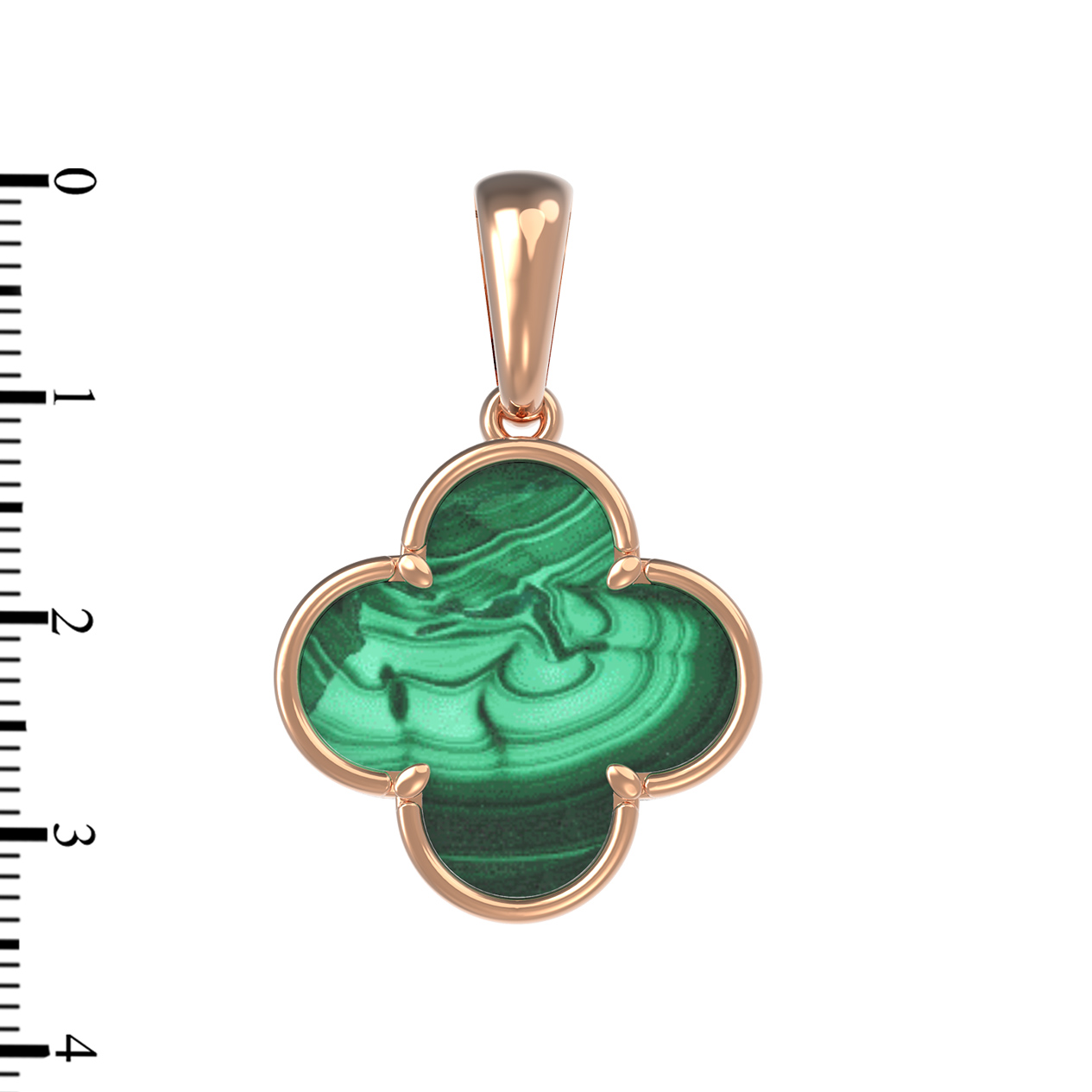 Подвеска из золота с малахитом — это изысканное ювелирное украшение, которое станет достойным дополнением вашего образа. Изделие выполнено из красного золота 585 пробы, что обеспечивает долговечность и благородный теплый оттенок металла. В центре внимания — натуральный зеленый малахит, который притягивает взгляд своей уникальной природной текстурой и насыщенным цветом. Дизайн в форме четырехлистного клевера символизирует удачу и гармонию, придавая украшению особый смысл.