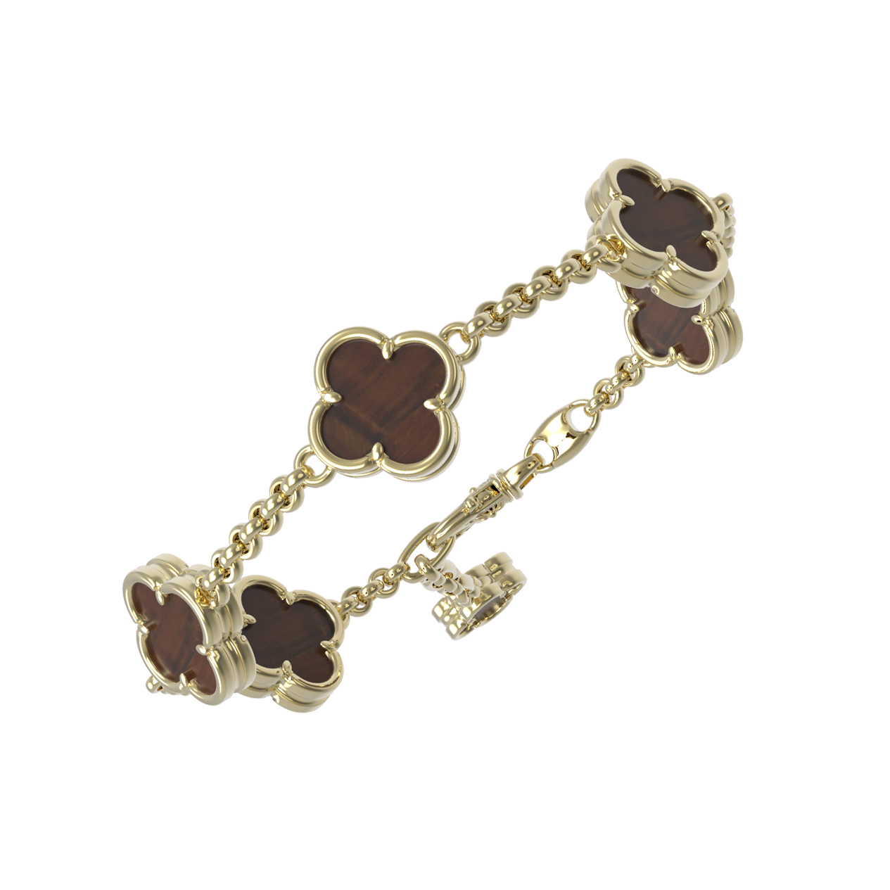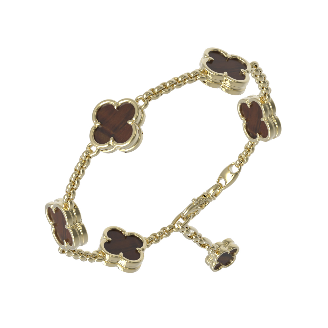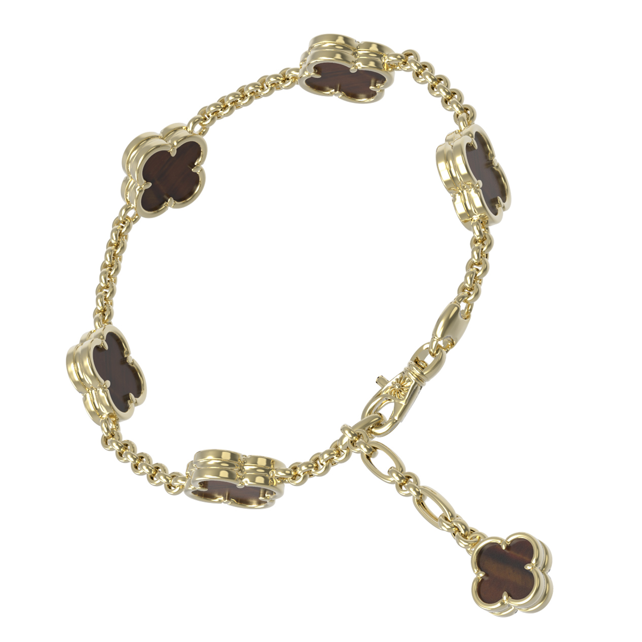 Изящный и выразительный браслет из лимонного золота 585 пробы станет центральным акцентом вашего образа. Это украшение входит в коллекцию De Luxe — Клевер весна, вдохновленную природной гармонией и эстетикой простых, но элегантных форм. Дизайн изделия выполнен в популярном стиле клевер, который ассоциируется с удачей и утонченным вкусом. Центральными элементами композиции выступают шесть вставок из натурального тигрового глаза, обладающего благородным оранжевым оттенком с характерным шелковистым переливом.
