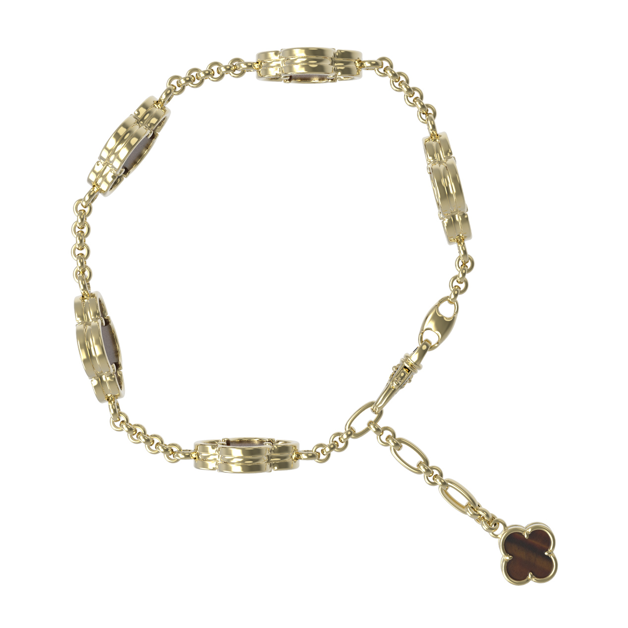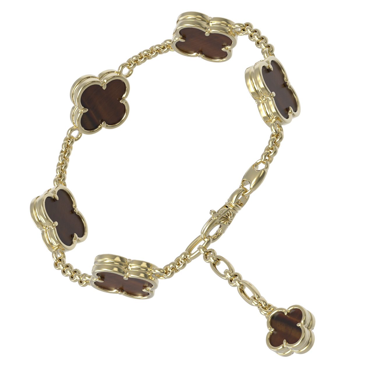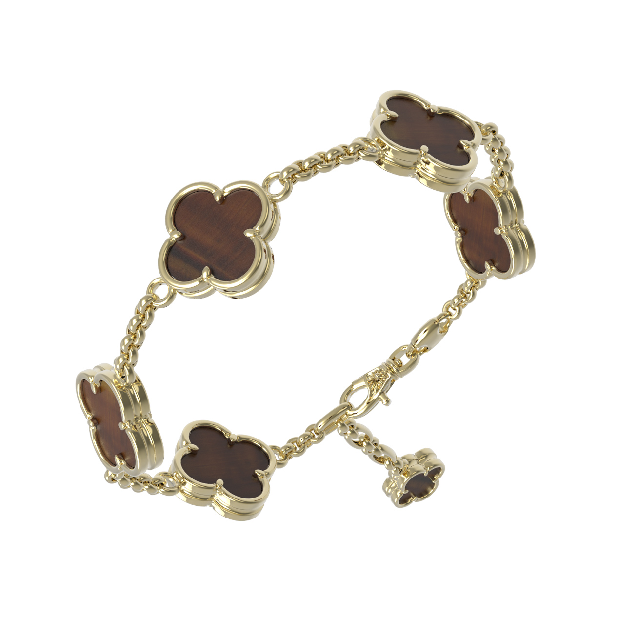 Центральным элементом композиции выступают 6 вставок из натурального тигрового глаза. Глубокий оранжевый оттенок камней красиво контрастирует с благородным блеском лимонного золота, создавая выразительную и притягательную игру света. Дизайн клевер, ставший современной классикой, придает браслету нотки утонченного шарма и легкости.
