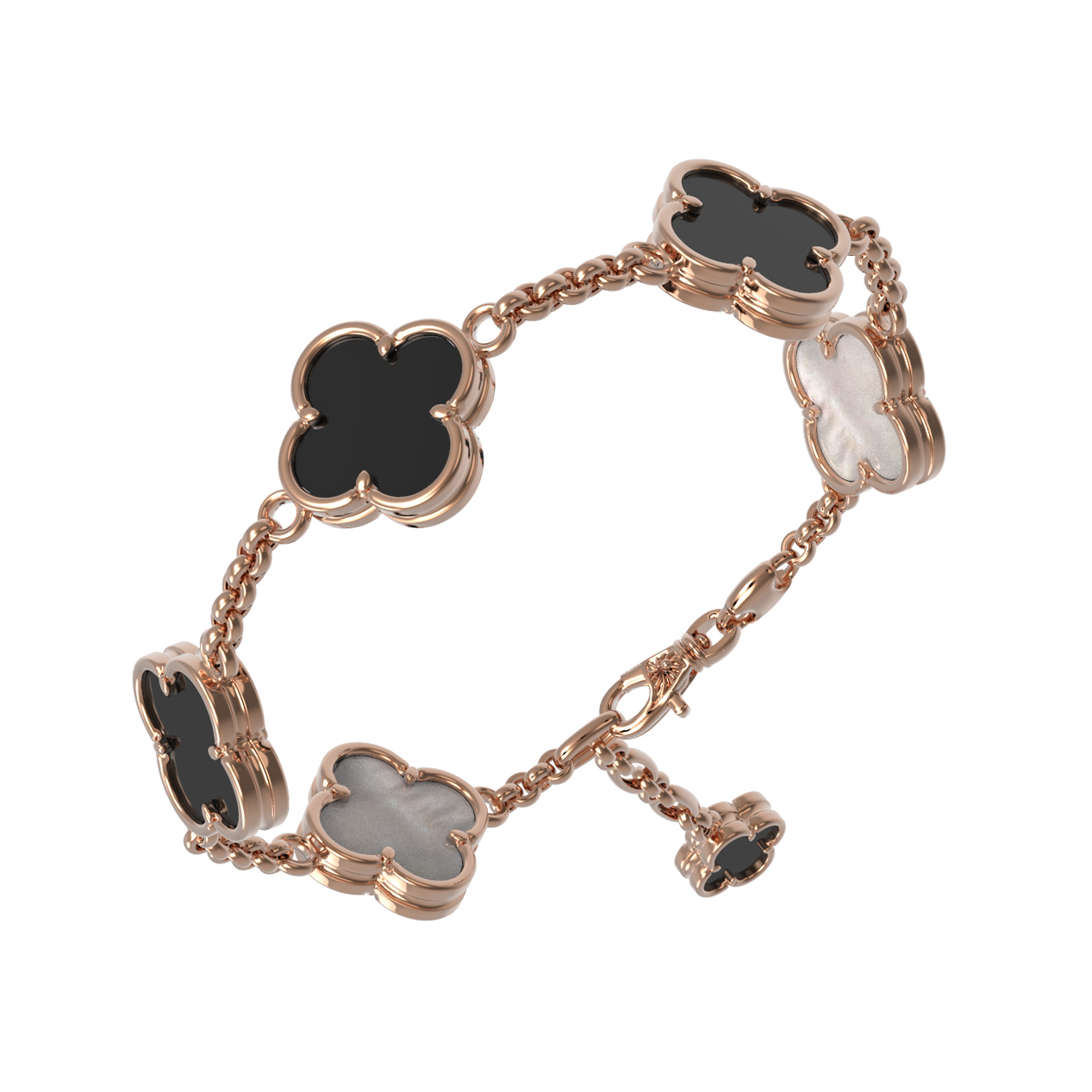 Центральным элементом композиции стали 6 вставок, гармонично сочетающих в себе два контрастных материала: глубокий черный оникс и нежный переливающийся перламутр. Чередование черного и перламутрового оттенков создает выразительную игру света, делая браслет центральным акцентом вашего образа. Лаконичное плетение основы идеально дополняет геометрию клевера, обеспечивая комфортную посадку на запястье.