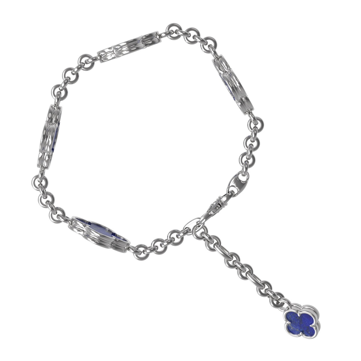 Центральными элементами украшения выступают 5 вставок из глубокого синего лазурита. Насыщенный цвет камня эффектно контрастирует с холодным блеском белого золота, создавая благородное и выразительное сочетание. Надежная цепочка подчеркивает изящество линий, а лаконичная форма вставок делает этот браслет универсальным аксессуаром.