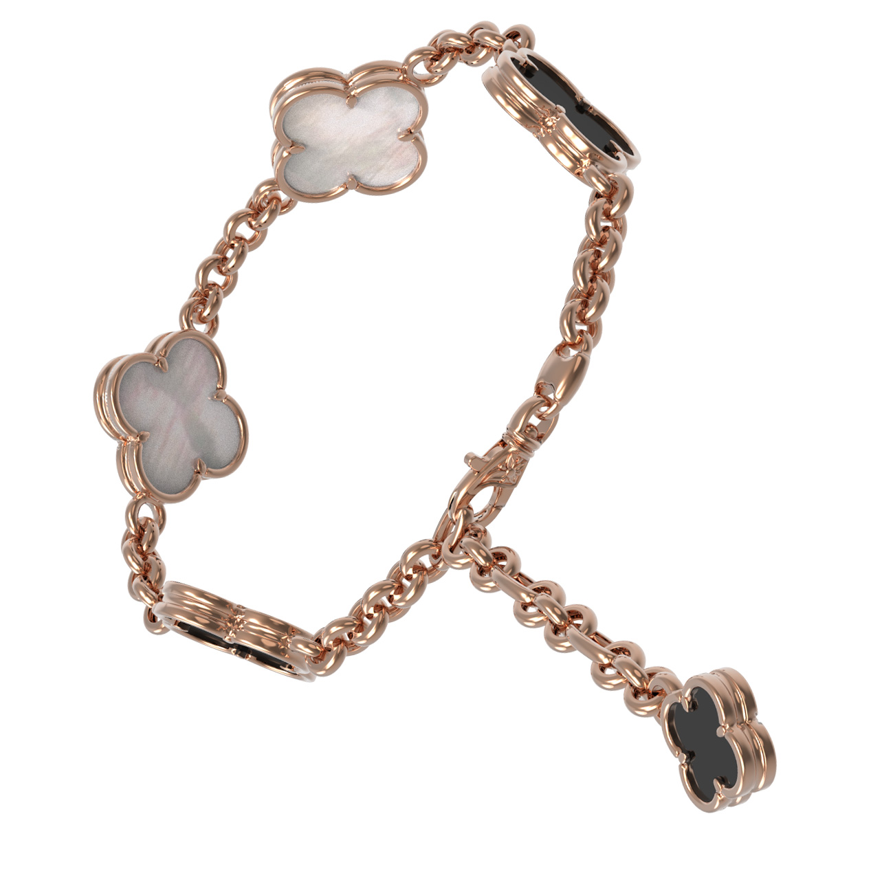 Центральным элементом украшения выступают пять вставок, чередующих глубокий черный оникс и нежный перламутр. Такое контрастное сочетание вставок делает браслет универсальным аксессуаром, который легко адаптируется к любому стилю одежды. Теплый оттенок красного золота красиво оттеняет природную красоту камней, создавая благородное сияние на запястье.
