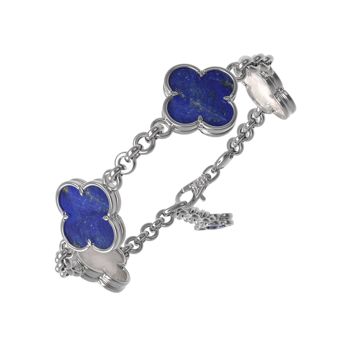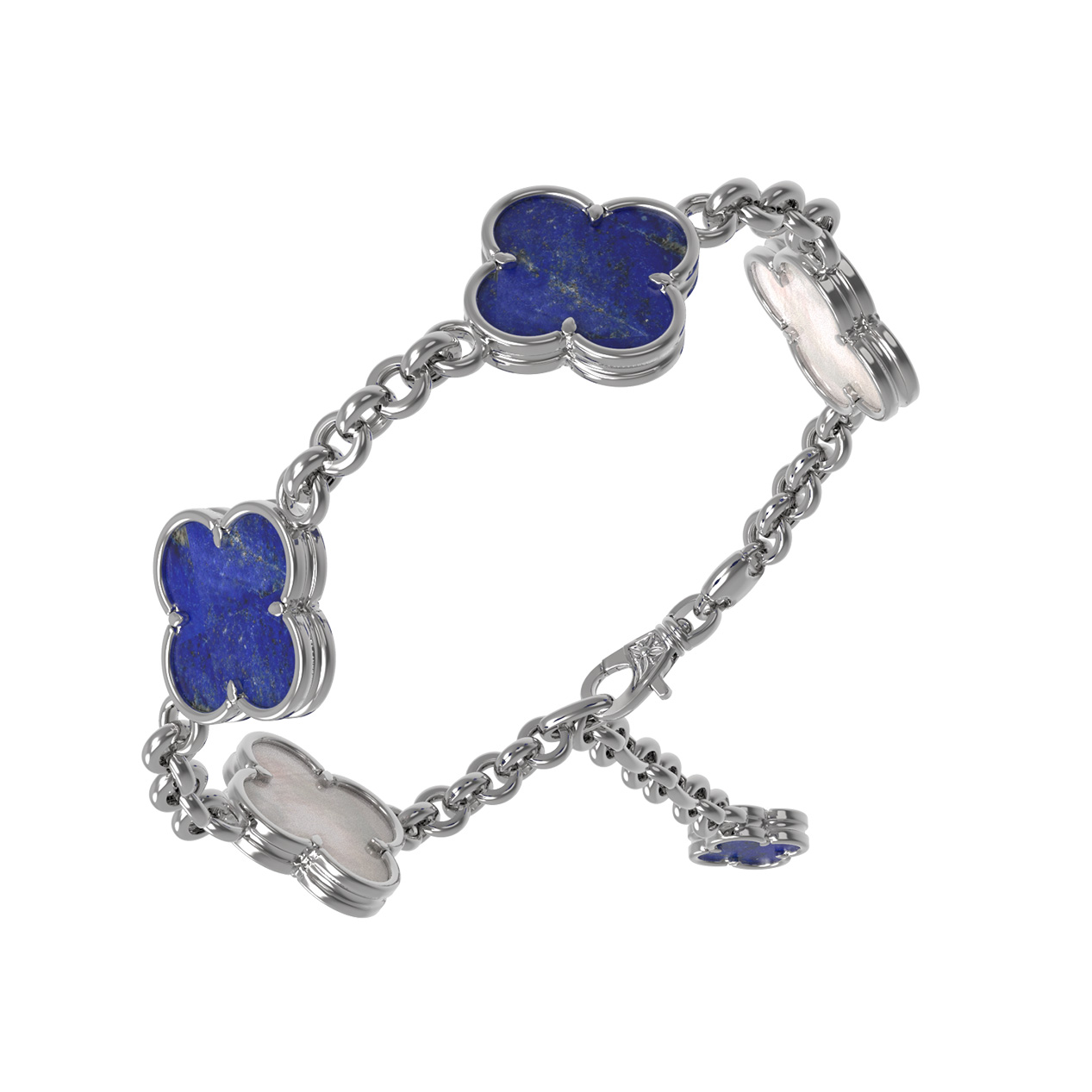 Изысканный браслет из белого золота 585 пробы из коллекции De Luxe — Клевер весна станет воплощением утонченного вкуса и символом удачи. В дизайне изделия мастерски обыграна популярная форма клевера, которая придает украшению особый шарм и узнаваемость. В качестве вставок использованы пять элементов, гармонично сочетающих в себе благородный лазурит насыщенного синего цвета и нежный перламутр с его мягким переливом.