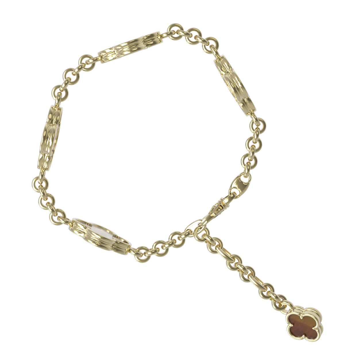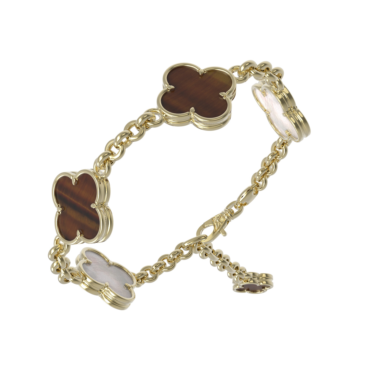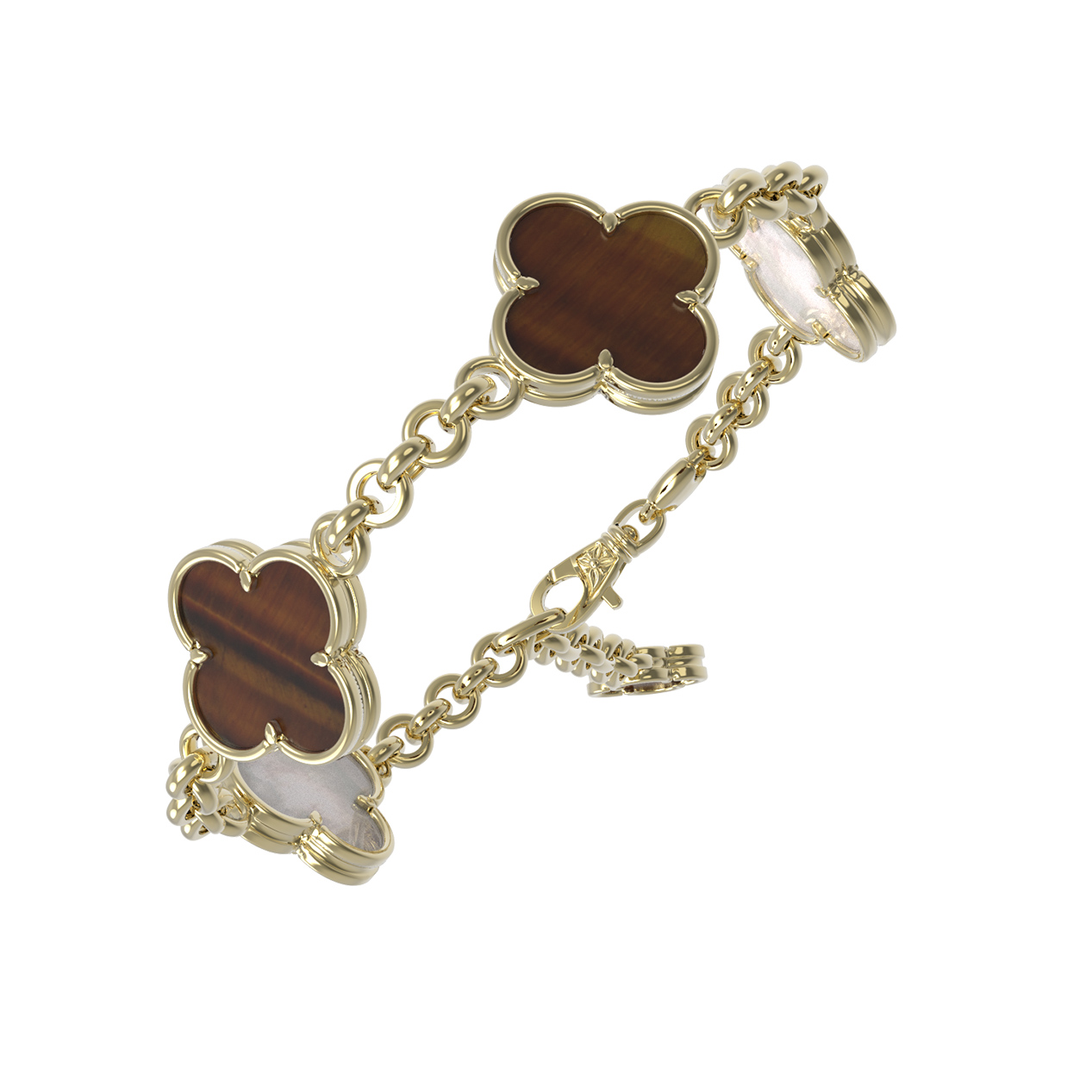 Особую притягательность браслету придают вставки из натуральных материалов. Мастера использовали 5 элементов: насыщенный оранжевый тигровый глаз и нежный перламутр, которые гармонично сочетаются с ярким блеском лимонного золота. Такое контрастное сочетание вставок делает изделие универсальным дополнением к любому образу, будь то строгий деловой костюм или вечерний наряд.