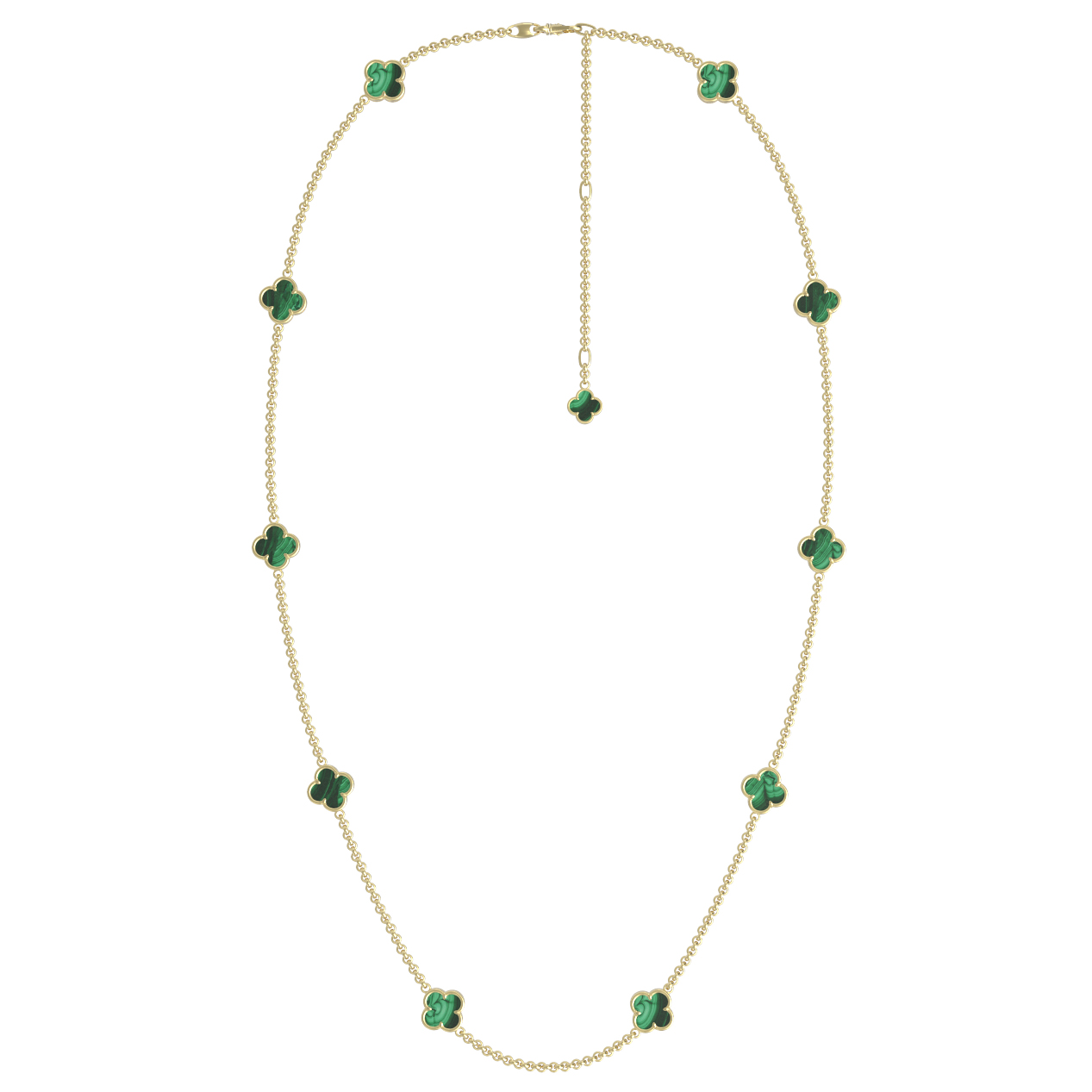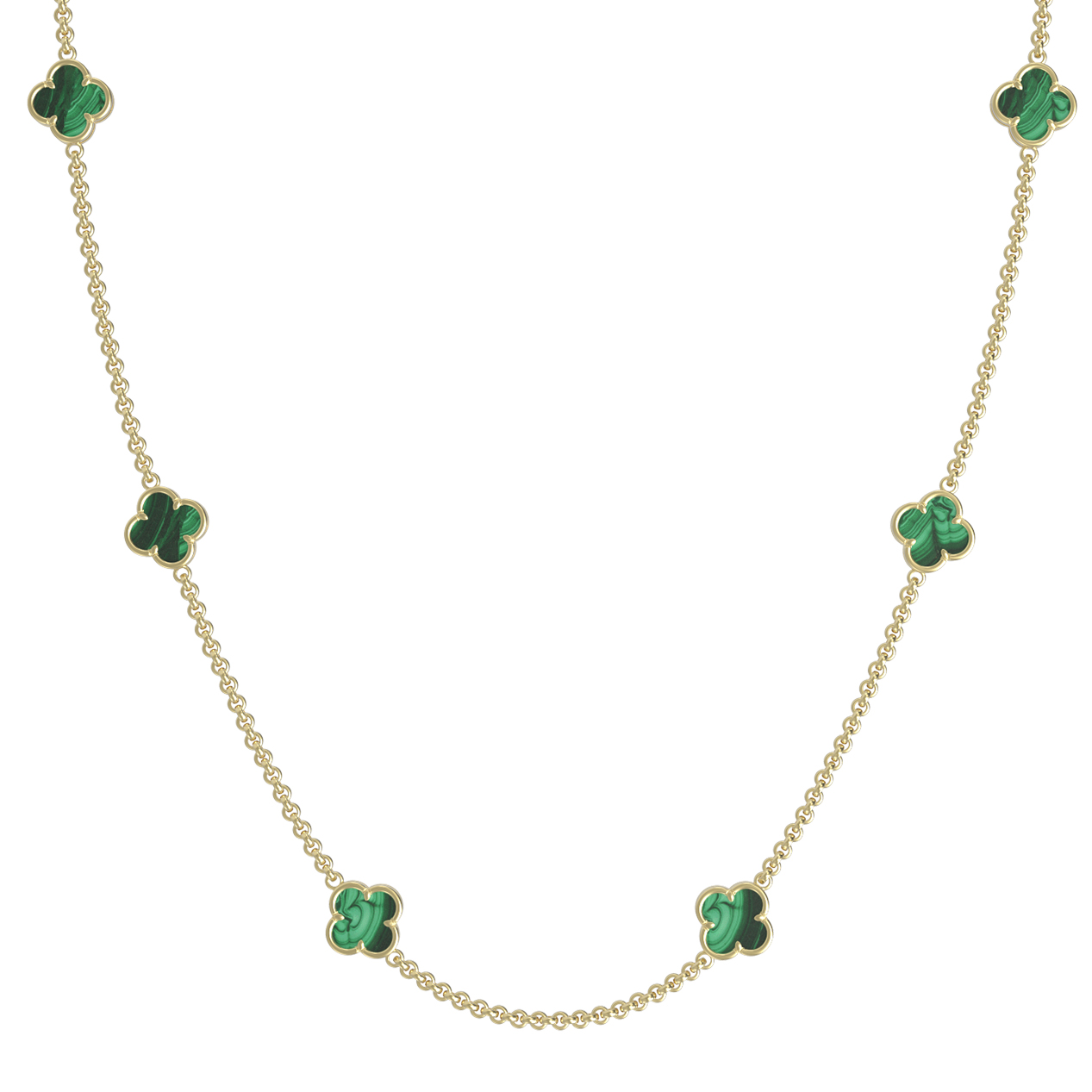 Представленное колье из коллекции De Luxe — Клевер весна отличается лаконичным и в то же время выразительным дизайном. Благодаря своей универсальности, украшение подходит как для женщин, так и для мужчин, подчеркивая индивидуальный стиль и чувство вкуса владельца. Изысканный зеленый оттенок малахита в сочетании с благородным лимонным металлом позволяет легко комбинировать изделие с другими украшениями.