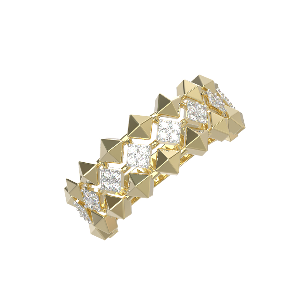 Кольцо из лимонного золота 585 пробы из коллекции De Luxe Бриллианты — это эффектное ювелирное изделие, сочетающее в себе дерзкую геометрию и утонченное сияние драгоценных камней. Дизайн модели привлекает внимание сложной фактурой: чередование пирамидальных золотых элементов с инкрустированными вставками создает выразительный объем, который смотрится эффектно на любом пальце. В кольце использованы 32 белых бриллианта круглой огранки, которые привносят в украшение игру света и благородный блеск.
