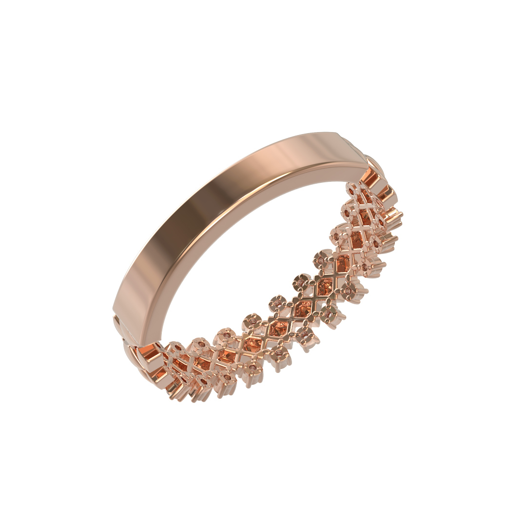 Элегантное кольцо из красного золота 585 пробы — это воплощение современного дизайна и безупречного ювелирного мастерства. Изделие из коллекции De Luxe Бриллианты привлекает внимание своей необычной геометрической формой, сочетая классический благородный металл с выразительными акцентами. Поверхность кольца украшена чередующимися металлическими пирамидами и сверкающими вставками, что придает украшению объем и динамику. В дизайне использовано 22 бриллианта круглой формы с чистым белым цветом, которые создают завораживающую игру света при каждом движении.