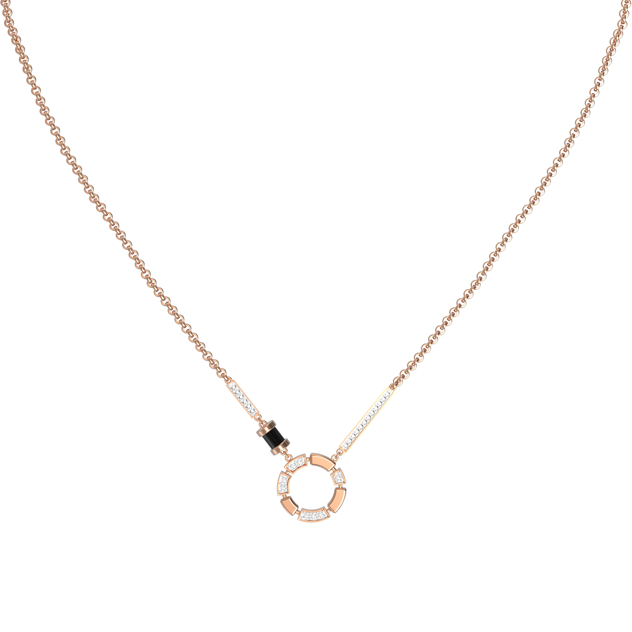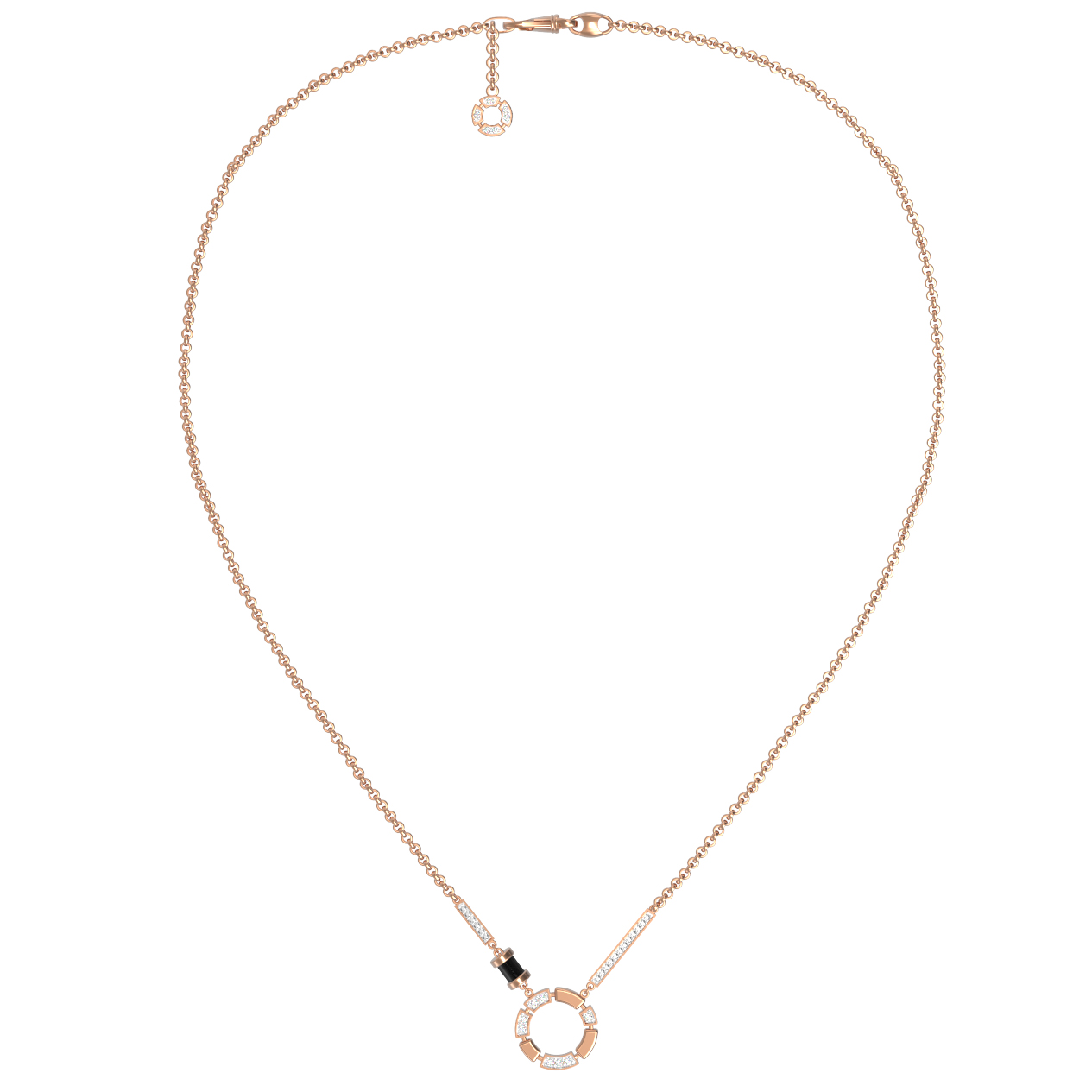 В декоре использованы 78 вставок: глубокий черный оникс цилиндрической формы эффектно дополняет сияние бриллиантов круглой огранки. Сочетание теплого оттенка красного золота с контрастными белыми и черными вставками создает выразительный акцент, который гармонично дополнит как деловой костюм, так и вечерний образ. Универсальный характер украшения позволяет носить его как женщинам, так и мужчинам, подчеркивая индивидуальность владельца.