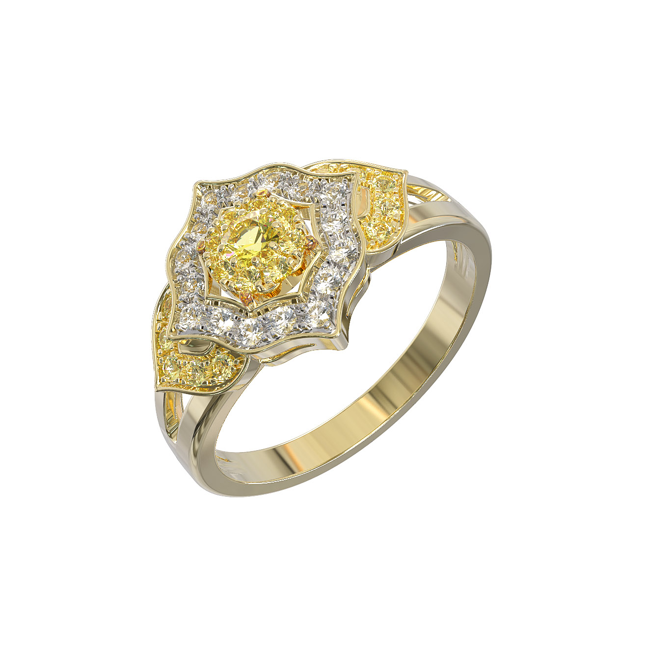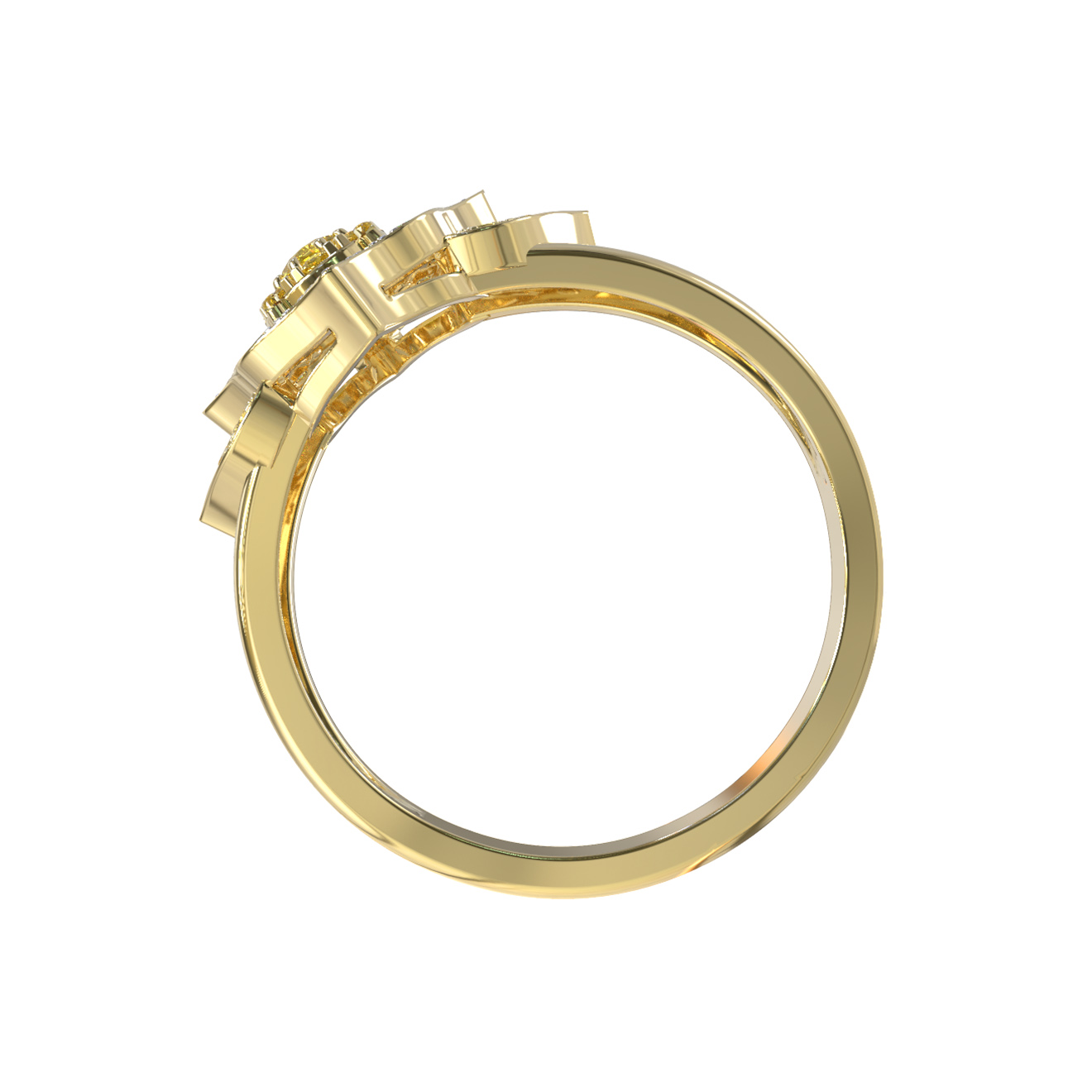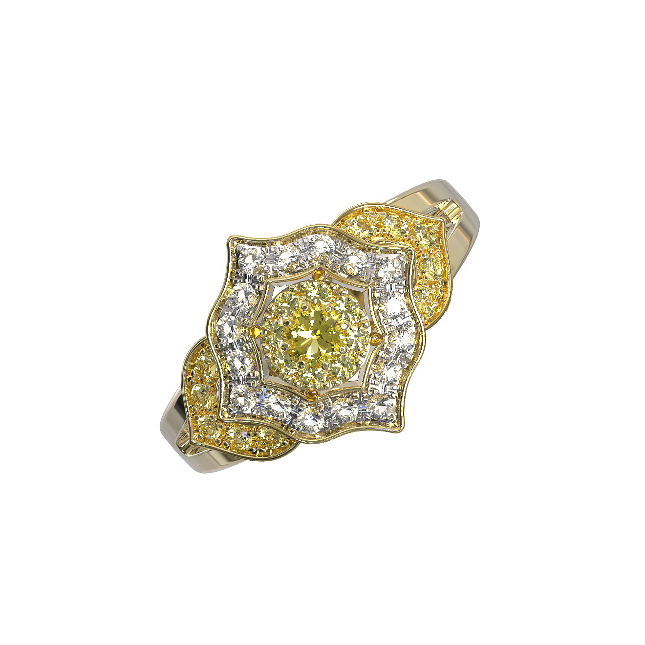 Всего в кольце использовано 35 вставок круглой формы, где сочетаются камни белого и желтого цвета. Лимонное золото придает украшению особую теплоту, делая его универсальным дополнением к любому образу. Это кольцо способно стать главным акцентом вашего стиля или частью изысканного комплекта, подчеркивающего статус и безупречный вкус владельца.