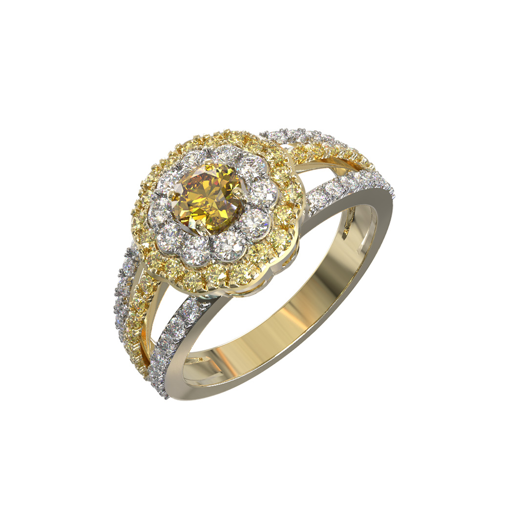 Дизайн изделия отличается сложной детализацией: декоративная часть украшена 79 вставками круглой огранки. Сочетание желтого и белого цветов вставок — бриллиантов и сапфиров — создает эффектный контраст с благородным блеском лимонного золота. Двойная шинка кольца, также инкрустированная драгоценными камнями, придает модели динамичность и визуальную легкость, несмотря на массивность и богатство исполнения.