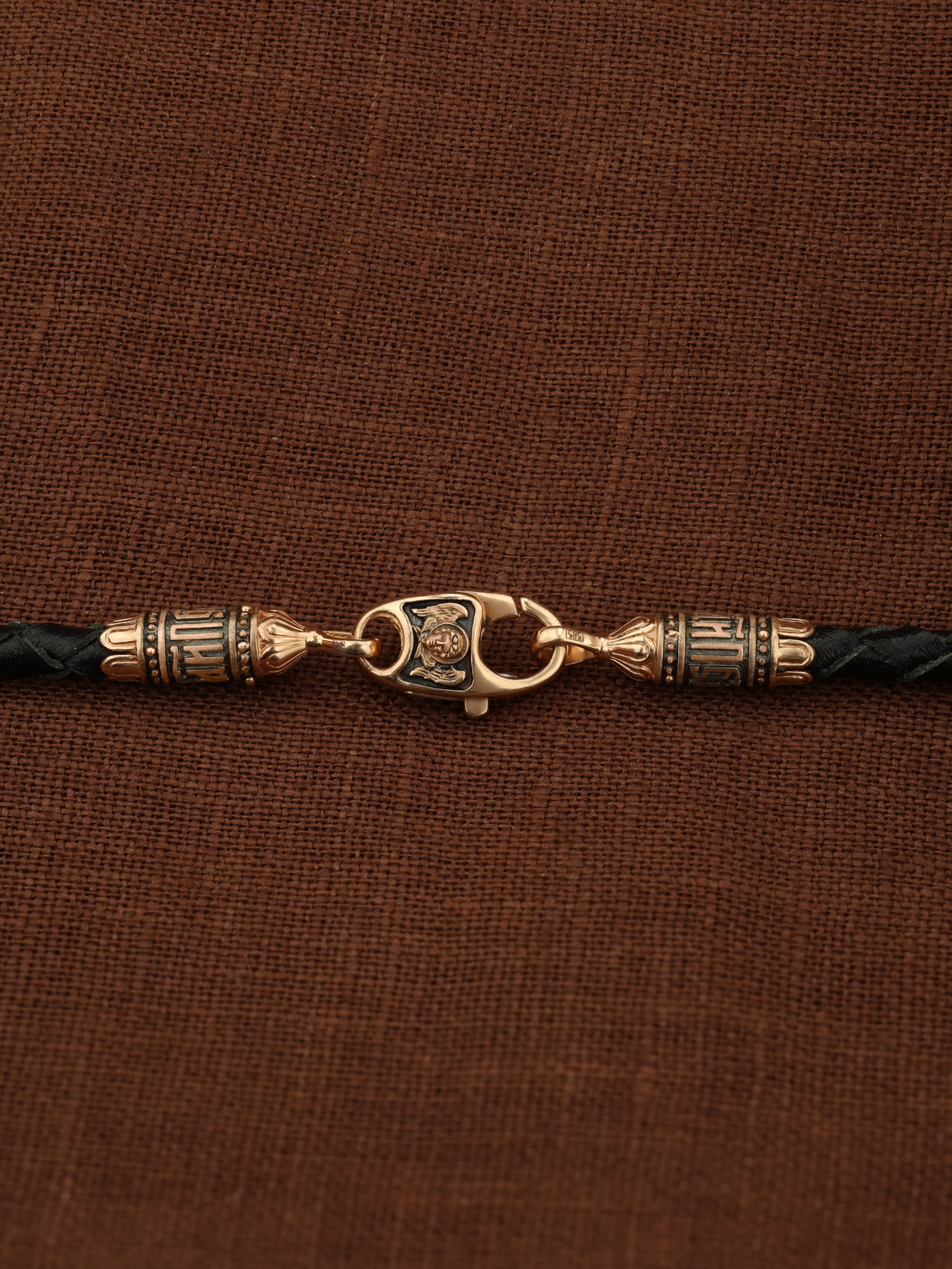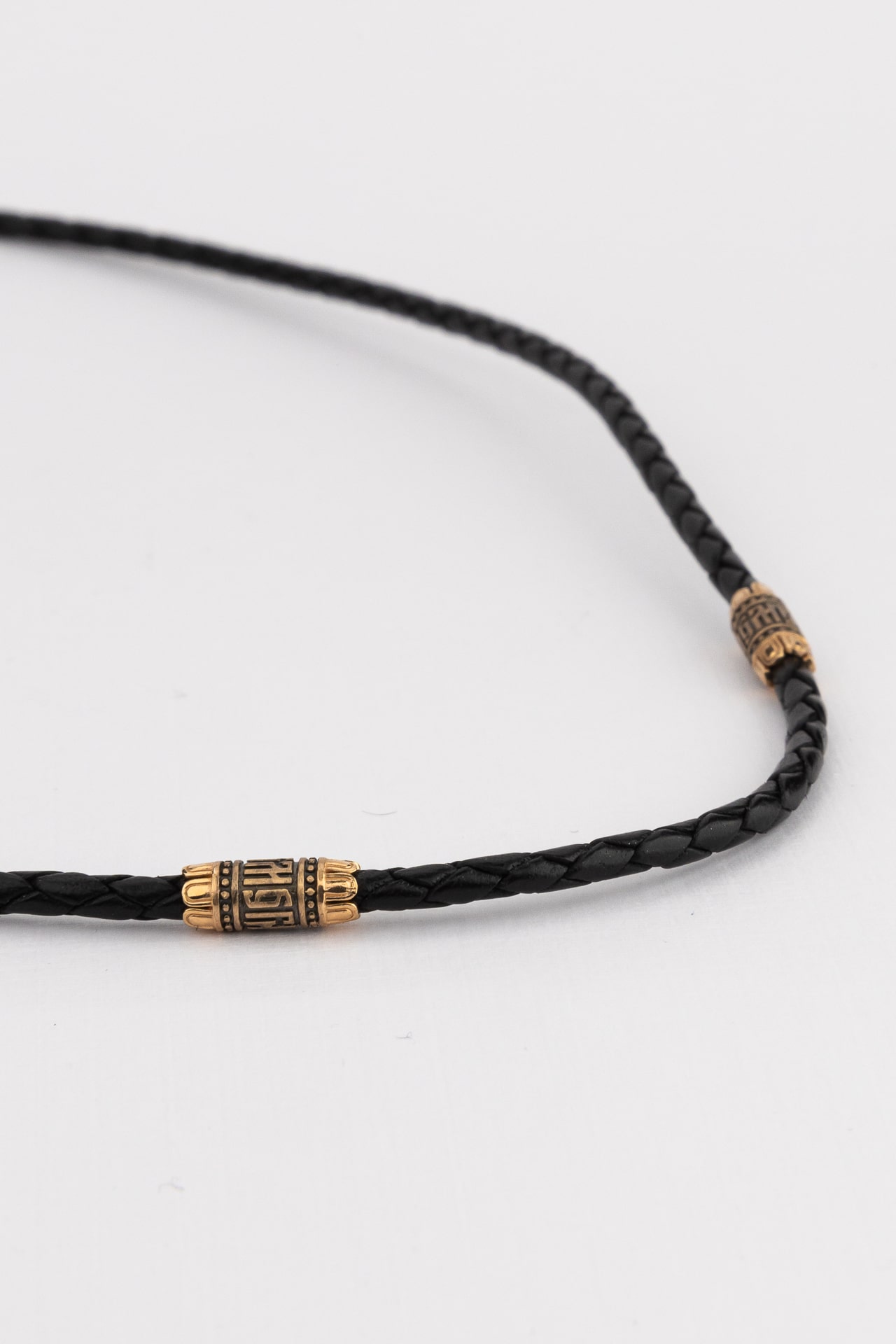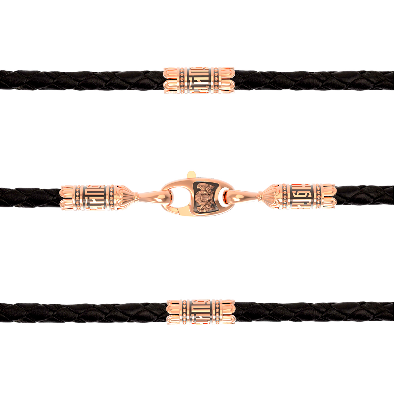 На шнурке цепи-шнурка расположены вставки, а на концах концевики с надписью: «Спаси и сохрани». Соединяет концевики замочек-карабин в форме рыбки. На замочке изображен шестикрылый Серафим.