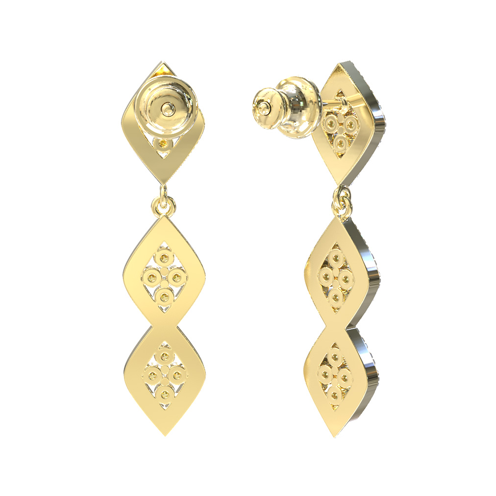 Особую изысканность изделию придают вставки в количестве 106 штук. Центр каждого элемента украшен яркими желтыми сапфирами круглой формы, которые гармонично дополняются сияющими белыми бриллиантами, обрамляющими контуры ромбов. Контраст благородного лимонного золота и цвета вставок делает серьги невероятно выразительными.