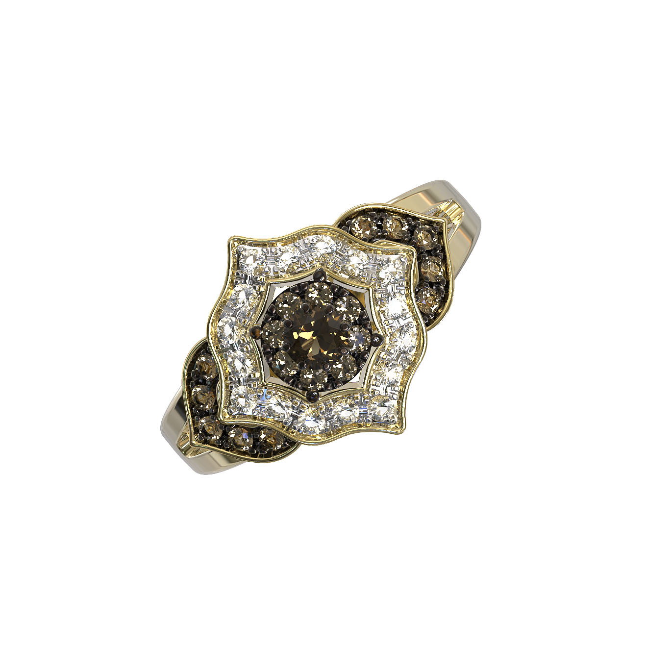 Элегантное кольцо из лимонного золота 585 пробы из коллекции De Luxe Бриллианты — Espresso станет безупречным украшением, подчеркивающим ваш утонченный вкус и статус. Это ювелирное изделие воплощает в себе гармонию классических форм и глубокого, насыщенного блеска драгоценных камней. Центральным акцентом композиции выступает выразительная вставка — роскошный бриллиант, окруженный ореолом сияющих камней, что создает эффектный контраст и привлекает внимание к каждой детали дизайна.