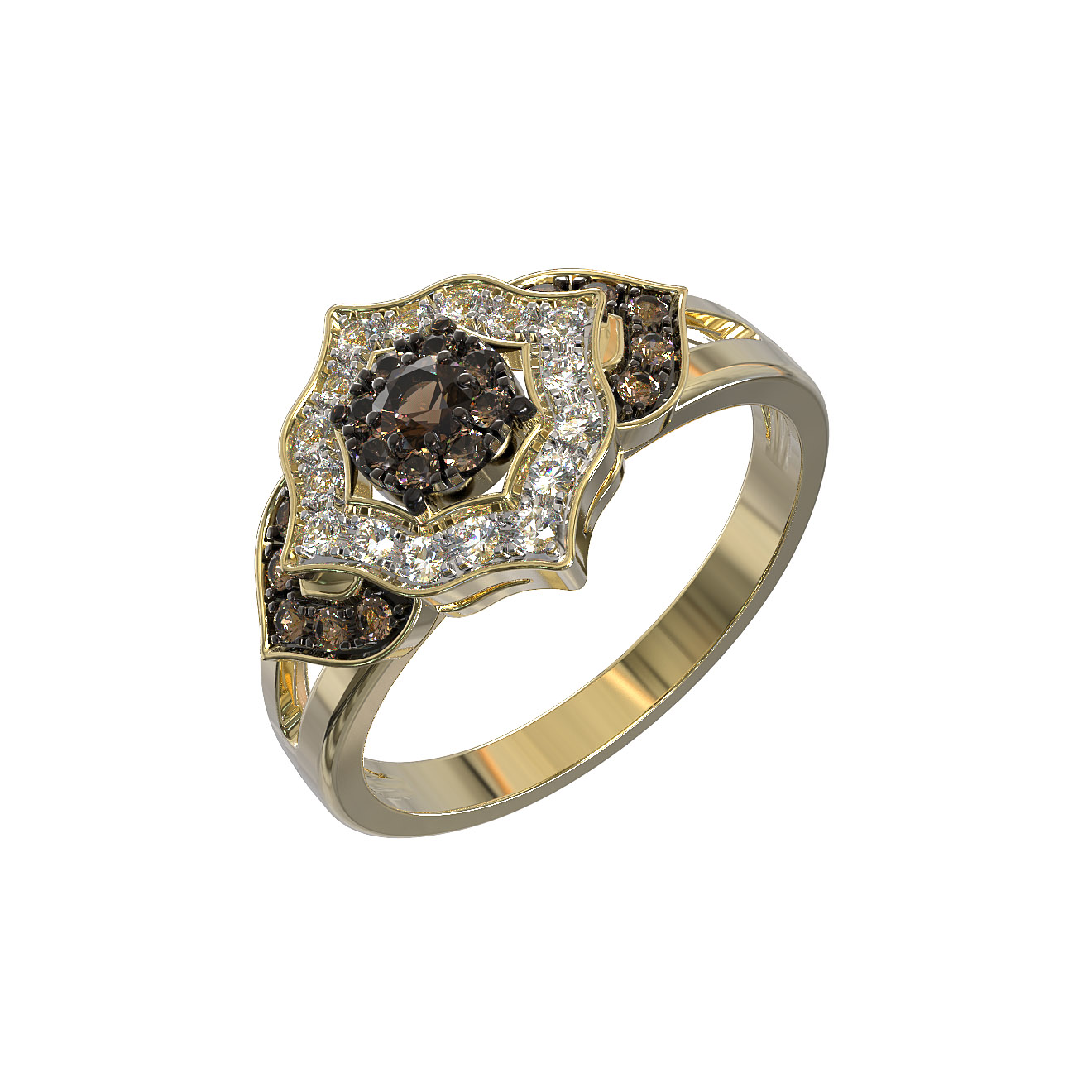 Всего в кольце закреплено 35 бриллиантов круглой формы, которые виртуозно играют светом при каждом движении руки. Использование лимонного золота придает украшению теплый, благородный оттенок, который идеально сочетается с коричневым цветом вставок. Тщательная проработка формы делает это кольцо универсальным аксессуаром, подходящим как для женщин, так и для мужчин.