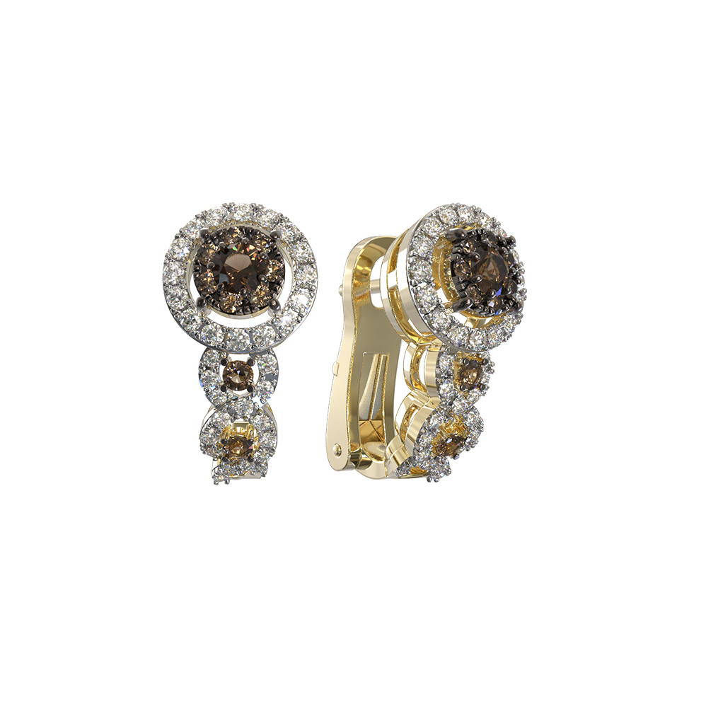 Роскошные серьги из лимонного золота 585 пробы из коллекции De Luxe Бриллианты — Espresso станут воплощением утонченного вкуса и высокого статуса. Благородный оттенок лимонного золота создает идеальную оправу для изысканной композиции, подчеркивая сияние драгоценных камней. Центральным элементом украшения выступают 84 бриллианта круглой формы, которые гармонично сочетаются с глубоким и насыщенным коричневым цветом основных вставок. Мастерская огранка камней позволяет им играть на свету, создавая завораживающие блики при каждом движении.
