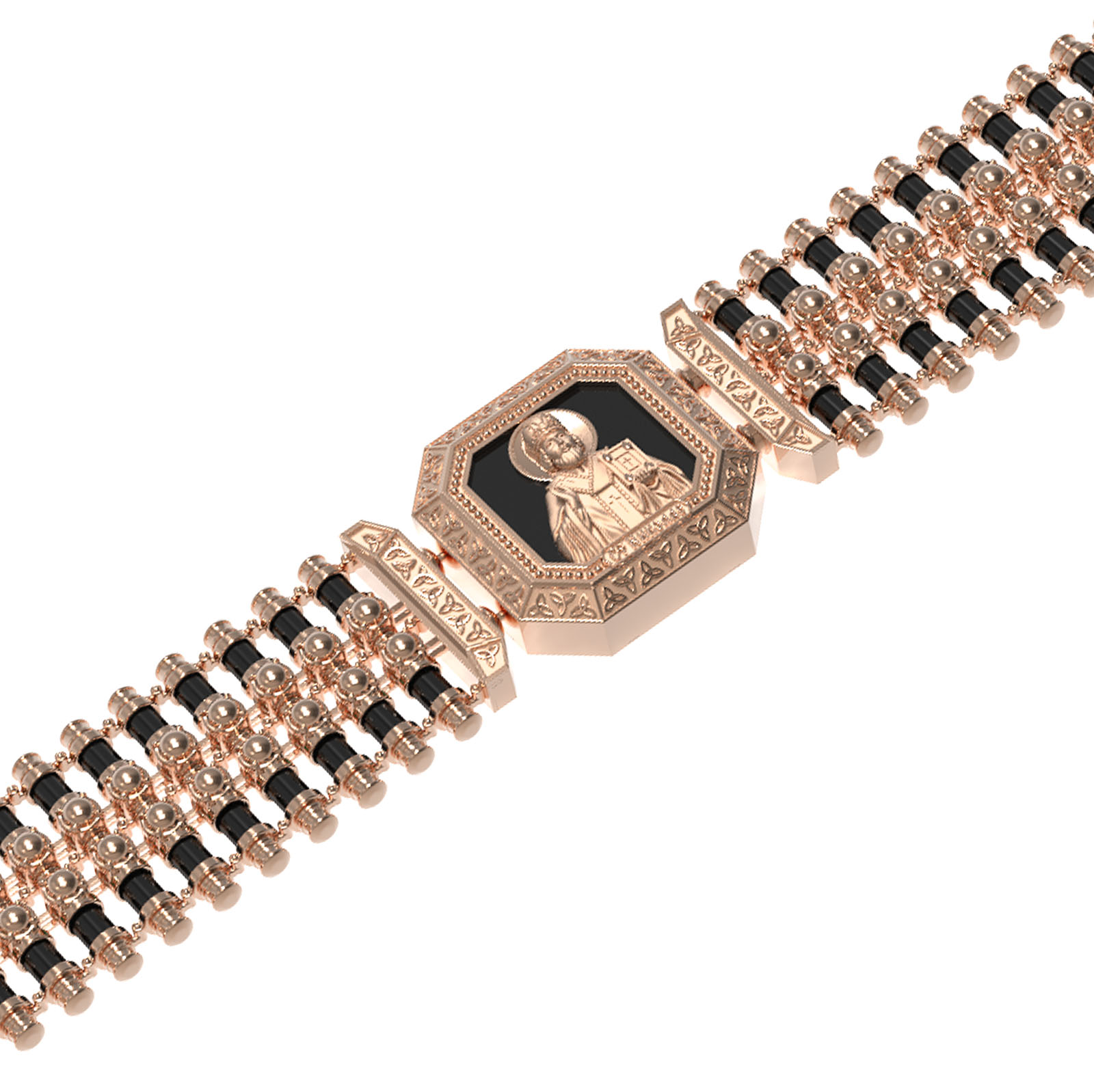 Лицевую сторону основного звена возглавляет икона Святителя Николая Чудотворца. Живший в III веке епископ Ликийского города Миры — самый почитаемый святой не только в России, но и во всем мире. Николай Чудотворец, помощник в делах, покровитель учащихся, утешитель обиженных и нуждающихся, целитель самых страшных и тяжелых недугов, предстатель и молитвенник за людей перед Богом. Также Святитель Николай Чудотворец известен своими молитвами за путешественников, когда непрестанный ветер и бушующие волны утихают и корабль заходит в спокойную гавань.