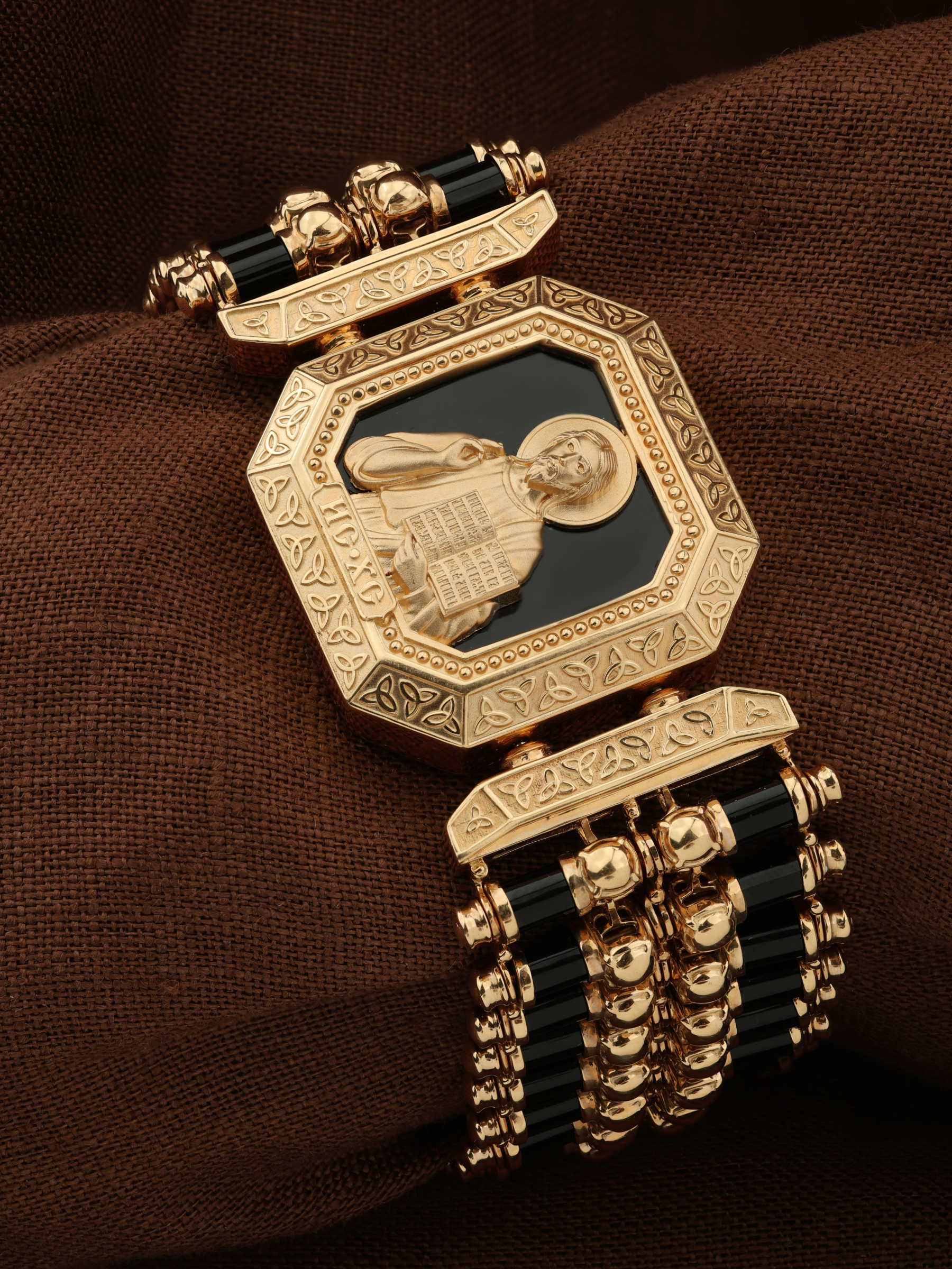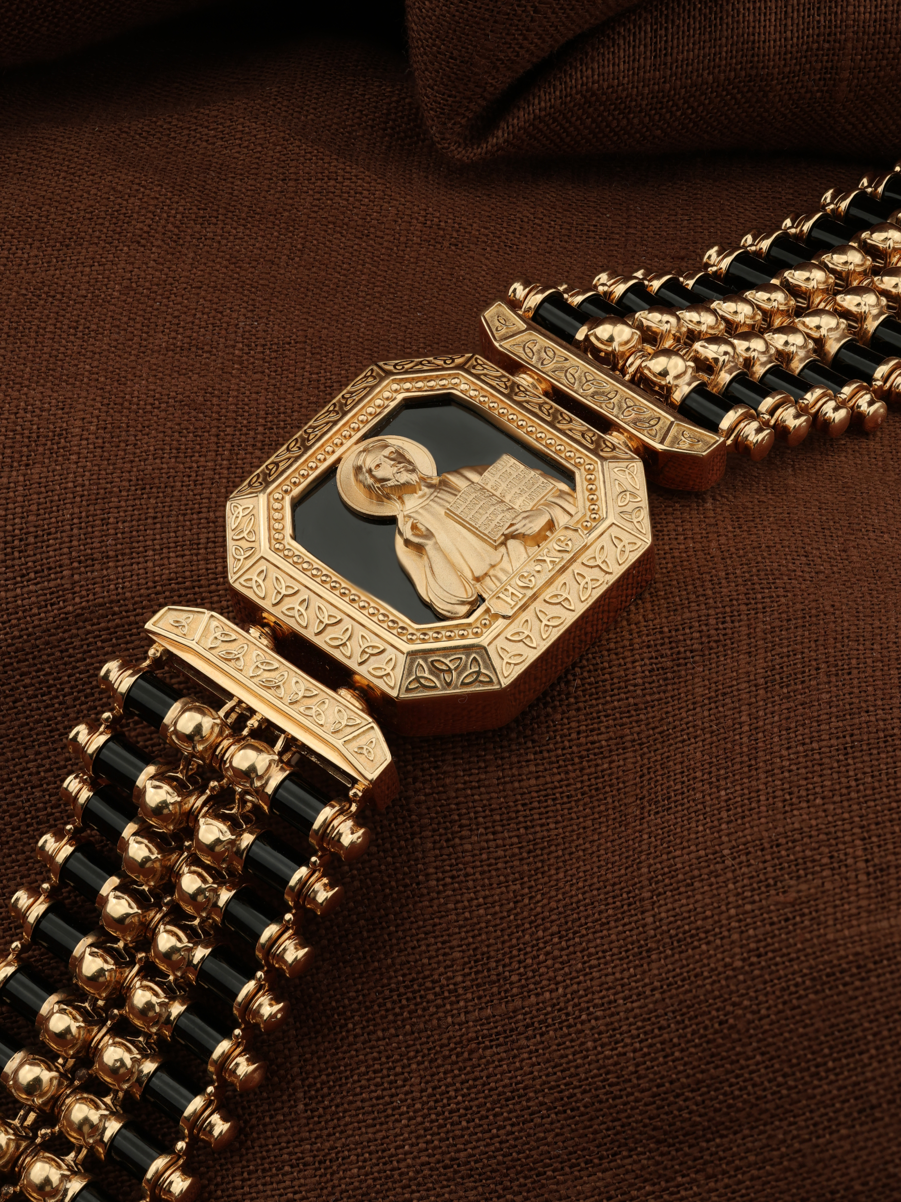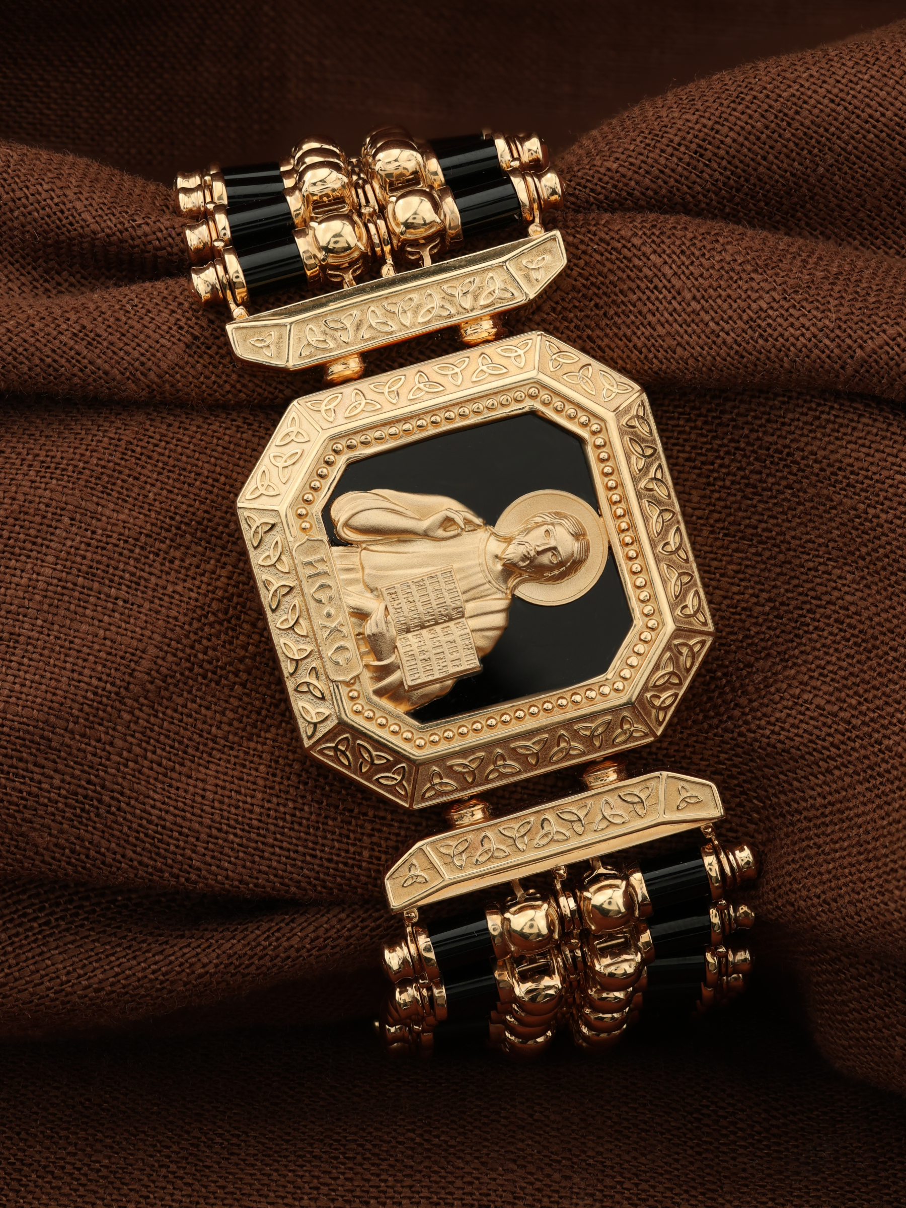 На лицевой стороне основного звена изображена икона Господа и Спасителя нашего Иисуса Христа — Господь Вседержитель или Пантократор (от греч. всевластный, всесильный). Он представлен как Царь Небесный и будущий Судия мира. Именование Иисуса «Вседержителем» указывает, с одной стороны, на Его Божественную природу: «Аз есмь Альфа и Омега, начало и конец, говорит Господь, Который есть и был и грядет, Вседержитель» (Откр. 1: 8). С другой стороны, такое именование связано и с человеческой природой Христа, искупившего крестной жертвой людские грехи и обновившего тем самым человеческую природу. Господь Иисусь Христос изображен фронтально огрудно. Главу Спасителя осеняет нимб, на нем угадывается крест. Крест символизирует голгофскую жертву Спасителя. По греческой традиции, на нимбе написаны буквы Омега, Омикрон, Ню — вместе они обозначают слово Сущий, одно из имен и характеристику Бога, согласно Священному Писанию. Правой рукой Он благословляет, а левой держит Евангелие — благую весть, принесенную Христом всему миру. Также означает она тот новый мир, который будет сотворен Богом после второго пришествия Христа. Символизирует и Книгу Жизни, где записаны имена всех, возлюбивших Бога. Всемогущий Бог предстает здесь не как обличающий судья, а как милостивый отец, ждущий возвращения блудных детей.