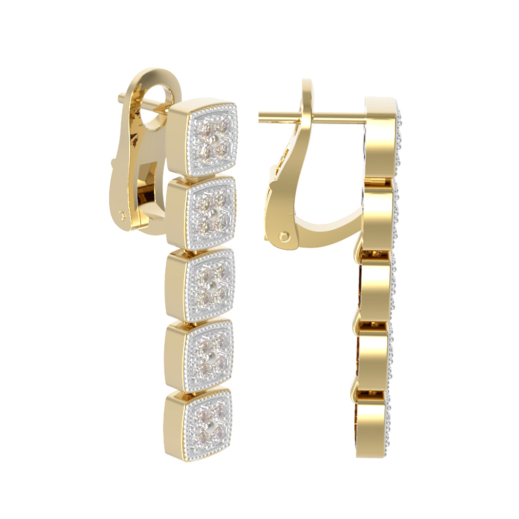 Дизайн модели представляет собой элегантную вертикальную композицию из квадратных звеньев, каждое из которых инкрустировано сверкающими бриллиантами. Всего в изделии использовано 40 вставок круглой огранки, которые создают завораживающую игру света при каждом вашем движении. Белый цвет вставок идеально дополняет лимонный оттенок металла, придавая украшению завершенный и аристократичный вид.