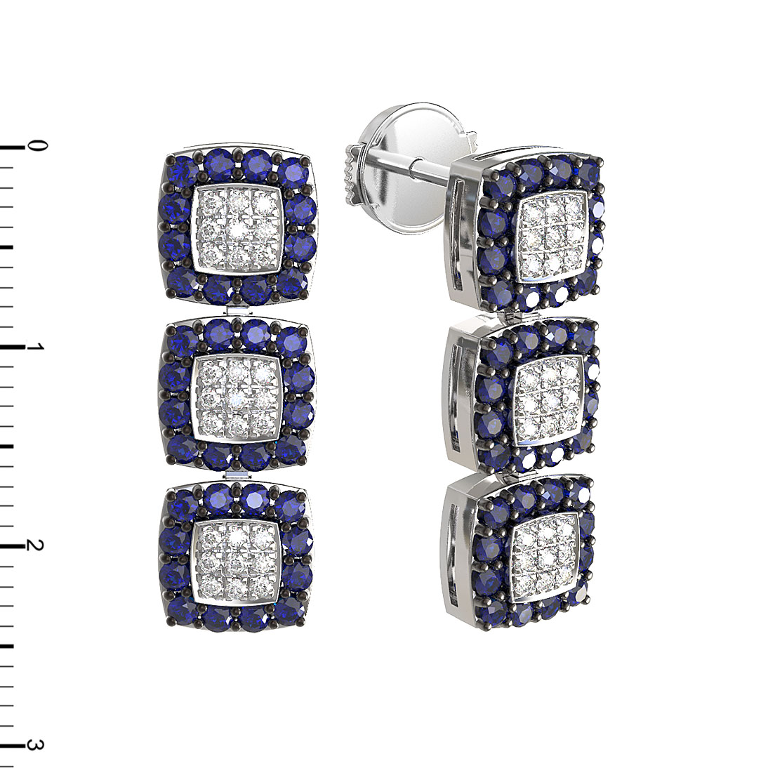 Роскошные серьги из белого золота 585 пробы из коллекции De Luxe Бриллианты — Quattro станут безупречным акцентом вашего образа. Дизайн украшения строится на гармоничном сочетании геометрических форм и глубокого блеска драгоценных камней. Изделие инкрустировано 126 вставками, среди которых — сияющие бриллианты и насыщенные сапфиры. Игра белого золота с синими и белыми камнями круглой формы создает эффектный контраст, приковывающий внимание к деталям.