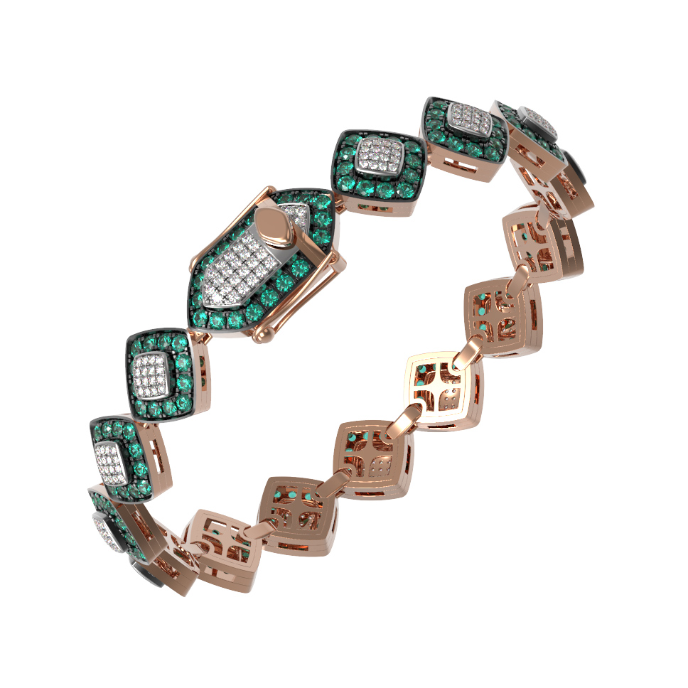 Центральным элементом композиции стали 1389 вставок, тщательно отобранных мастерами. Изысканное сочетание бриллиантов белого цвета и изумрудов насыщенного зелёного оттенка создает притягательный контраст. Круглая форма вставок придает украшению мягкость и динамику, позволяя свету максимально эффектно преломляться при каждом движении. Особая геометрия звеньев делает этот браслет не только украшением, но и настоящим произведением ювелирного искусства.