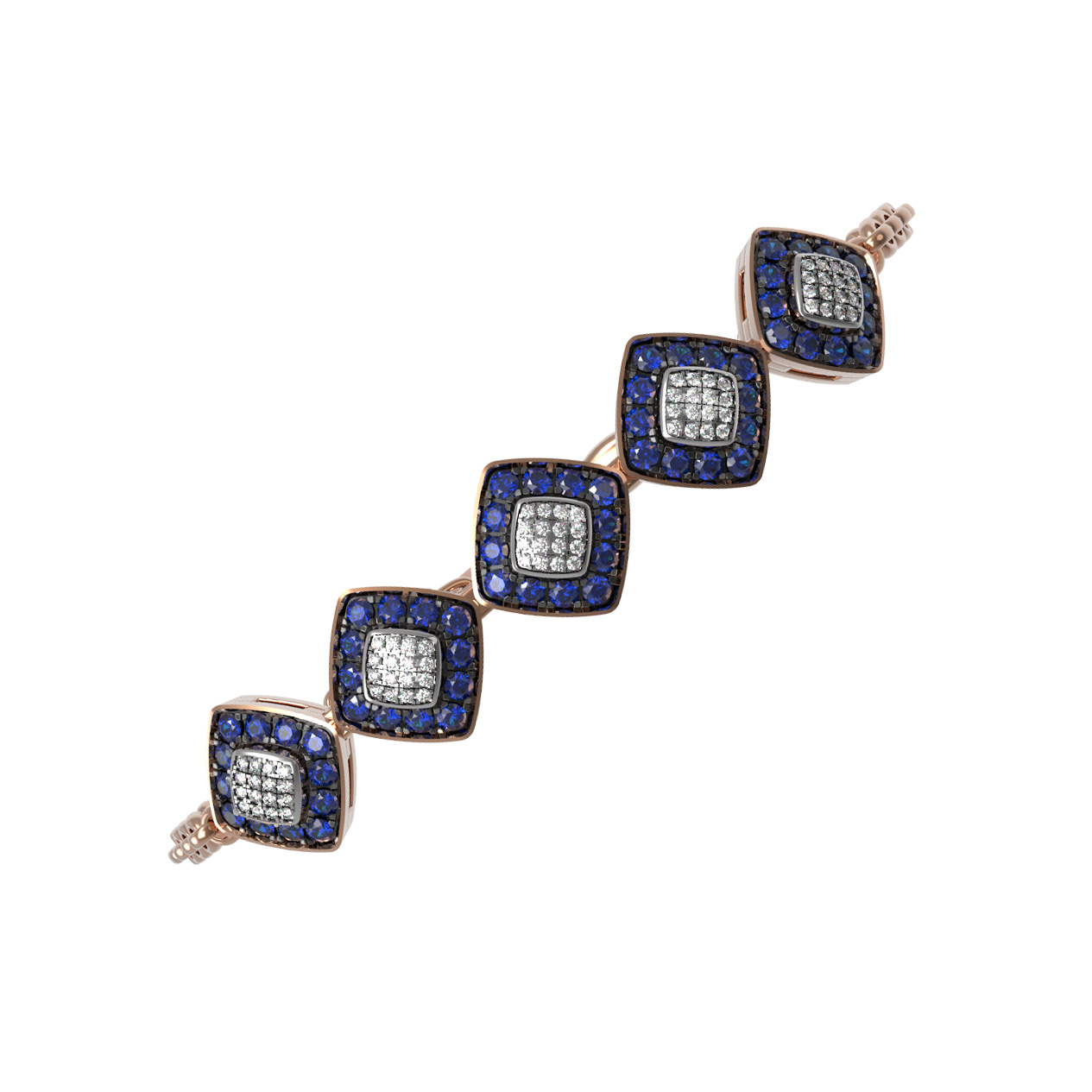 Центральная часть декоративных звеньев инкрустирована сияющими белыми бриллиантами, которые окружены насыщенными синими сапфирами. Всего в дизайне использовано 140 камней круглой огранки, создающих эффектную игру света и цвета. Гармоничное сочетание красного золота, прозрачных бриллиантов и глубоких сапфиров делает этот браслет универсальным аксессуаром.
