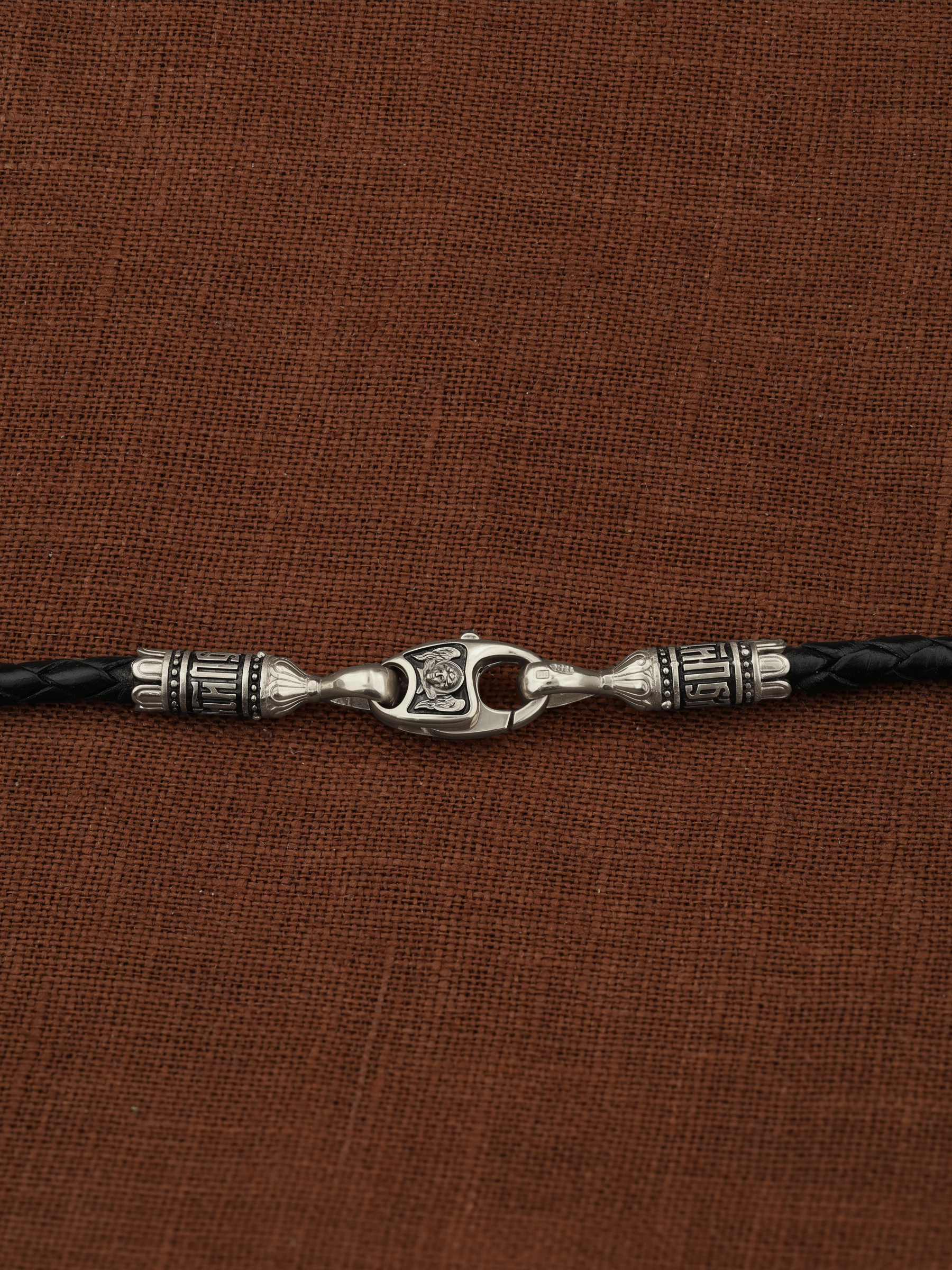 На концах цепи-шнурка расположены концевики с надписью: «Спаси и сохрани». Соединяет концевики замочек-карабин в форме рыбки. На замочке изображен шестикрылый Серафим.