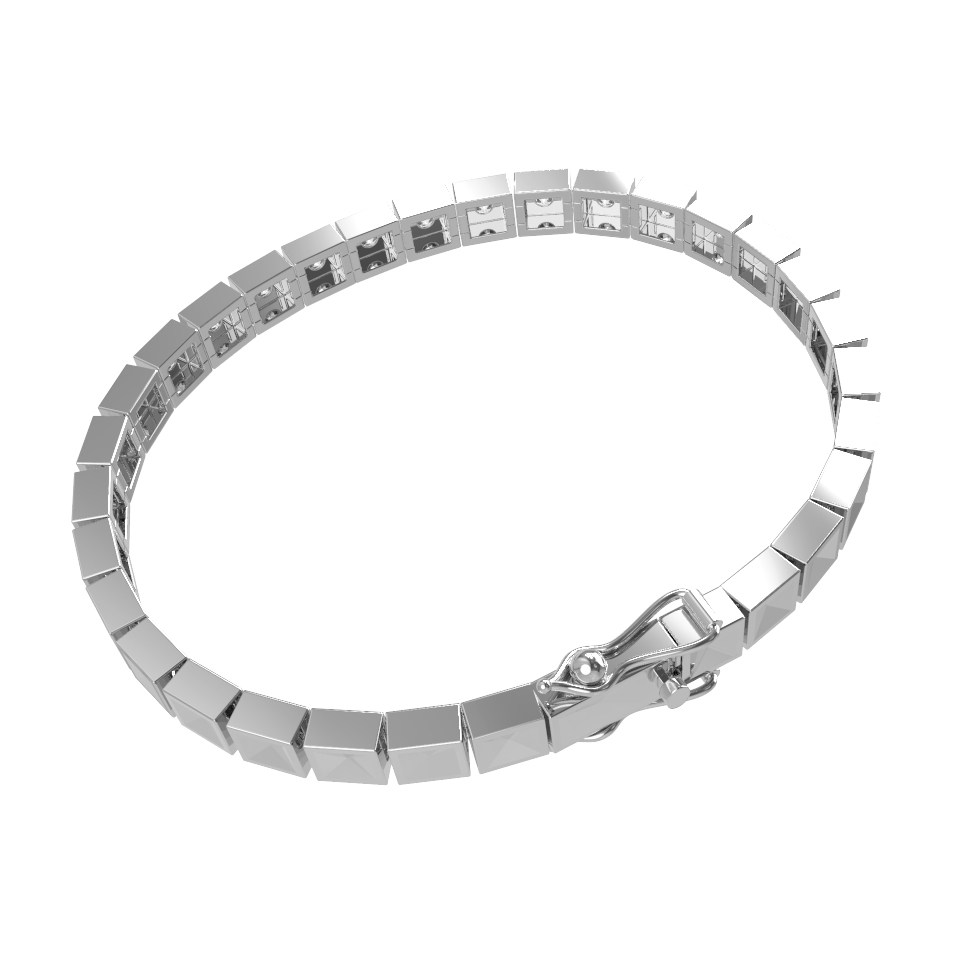 Дизайн браслета построен на геометрической точности: звенья в форме квадратов создают строгую и современную композицию. В центре каждого элемента надежно закреплен бриллиант круглой огранки. Белый цвет вставок гармонично сочетается с материалом оправы, создавая единый монохромный образ, который выглядит невероятно дорого и притягательно. Всего в украшении использовано 48 бриллиантов, придающих ему благородное мерцание при каждом движении руки.