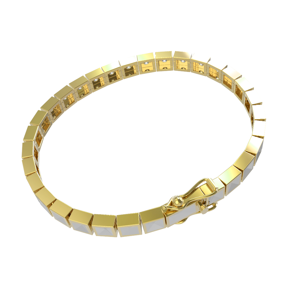 Дизайн браслета построен на ритмичном повторении квадратных звеньев, каждое из которых инкрустировано сверкающим камнем. В качестве вставки использованы 48 бриллиантов белого цвета круглой формы огранки. Прозрачные камни великолепно контрастируют с теплым, солнечным оттенком лимонного золота, создавая эффектный блеск при любом освещении. Качественная обработка металла и надежная фиксация вставок гарантируют долговечность и комфорт при повседневном ношении.