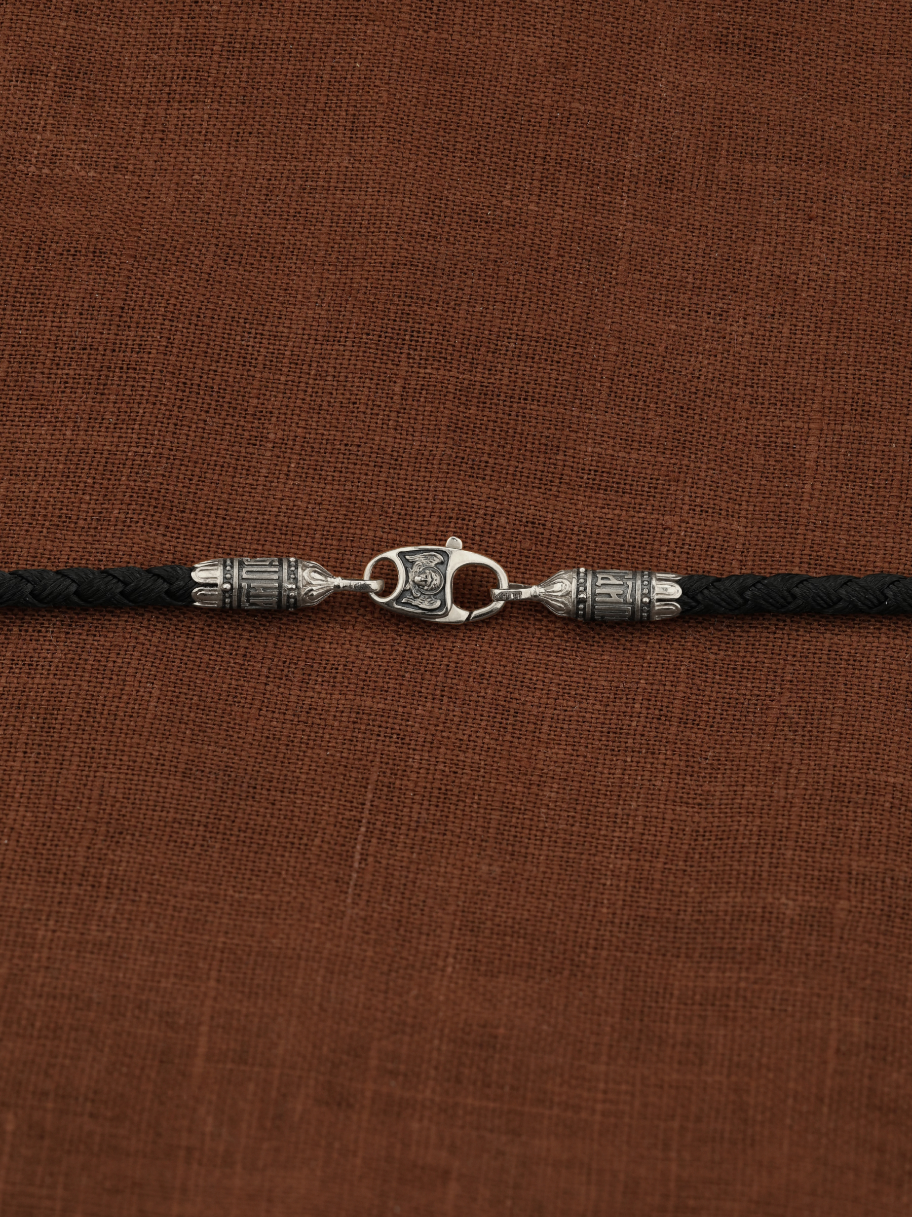 На концах цепи-шнурка расположены концевики с надписью: «Спаси и сохрани». Соединяет концевики замочек-карабин в форме рыбки. На замочке изображен шестикрылый Серафим.
