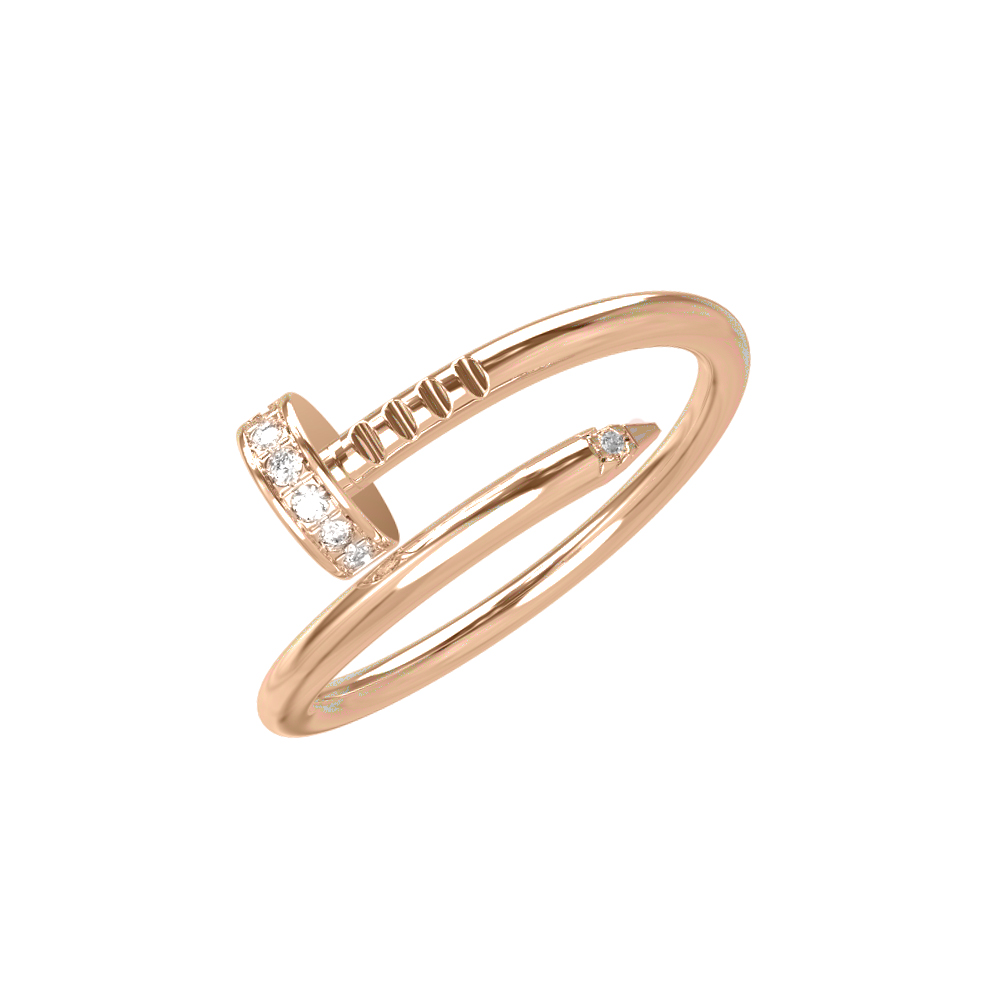 Кольцо из красного золота 585 пробы из коллекции De Luxe — Гвоздь — это выразительное украшение, выполненное в оригинальном дизайне в форме гвоздя. Лаконичная и смелая эстетика изделия подчеркивает индивидуальность своего обладателя, делая акцент на современной ювелирной моде. Аксессуар гармонично смотрится на руке, объединяя в себе дерзкую форму и классический драгоценный материал. На головке гвоздя расположено 9 сияющих бриллиантов круглой формы с белым цветом вставок, которые добавляют блеска и роскоши этому стильному украшению.