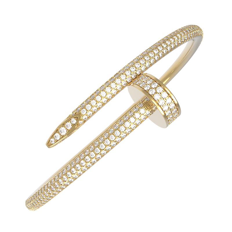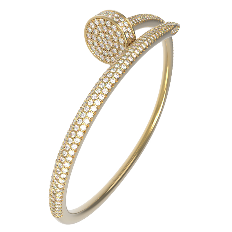 Роскошный браслет из лимонного золота 585 пробы из коллекции De Luxe — Гвоздь станет безупречным акцентом вашего образа. Дизайн в форме гвоздя сочетает в себе смелую эстетику и непревзойденное ювелирное мастерство, создавая украшение, которое одинаково эффектно смотрится как на женщинах, так и на мужчинах. Утонченное сияние лимонного золота гармонично дополнено россыпью драгоценных камней: изделие инкрустировано 1488 бриллиантами круглой огранки с белым цветом вставок, которые создают завораживающую игру света при каждом движении.