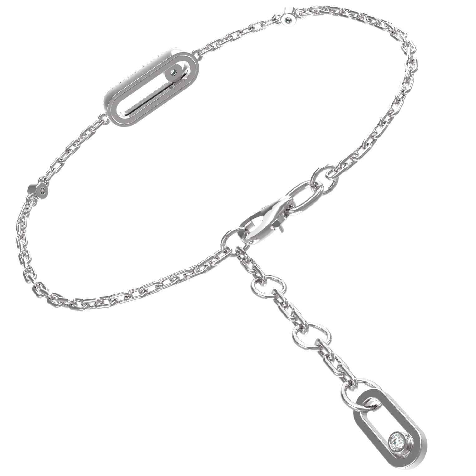 Центральным элементом композиции является изящная деталь, украшенная 29 бриллиантами круглой огранки. Белый цвет вставок гармонично сочетается с холодным блеском белого золота, создавая игру света, которая притягивает взгляды. Использование драгоценных камней придает украшению особую ценность и выразительность. Браслет отличается лаконичным исполнением и продуманной конструкцией цепи, обеспечивающей комфортную посадку на запястье.
