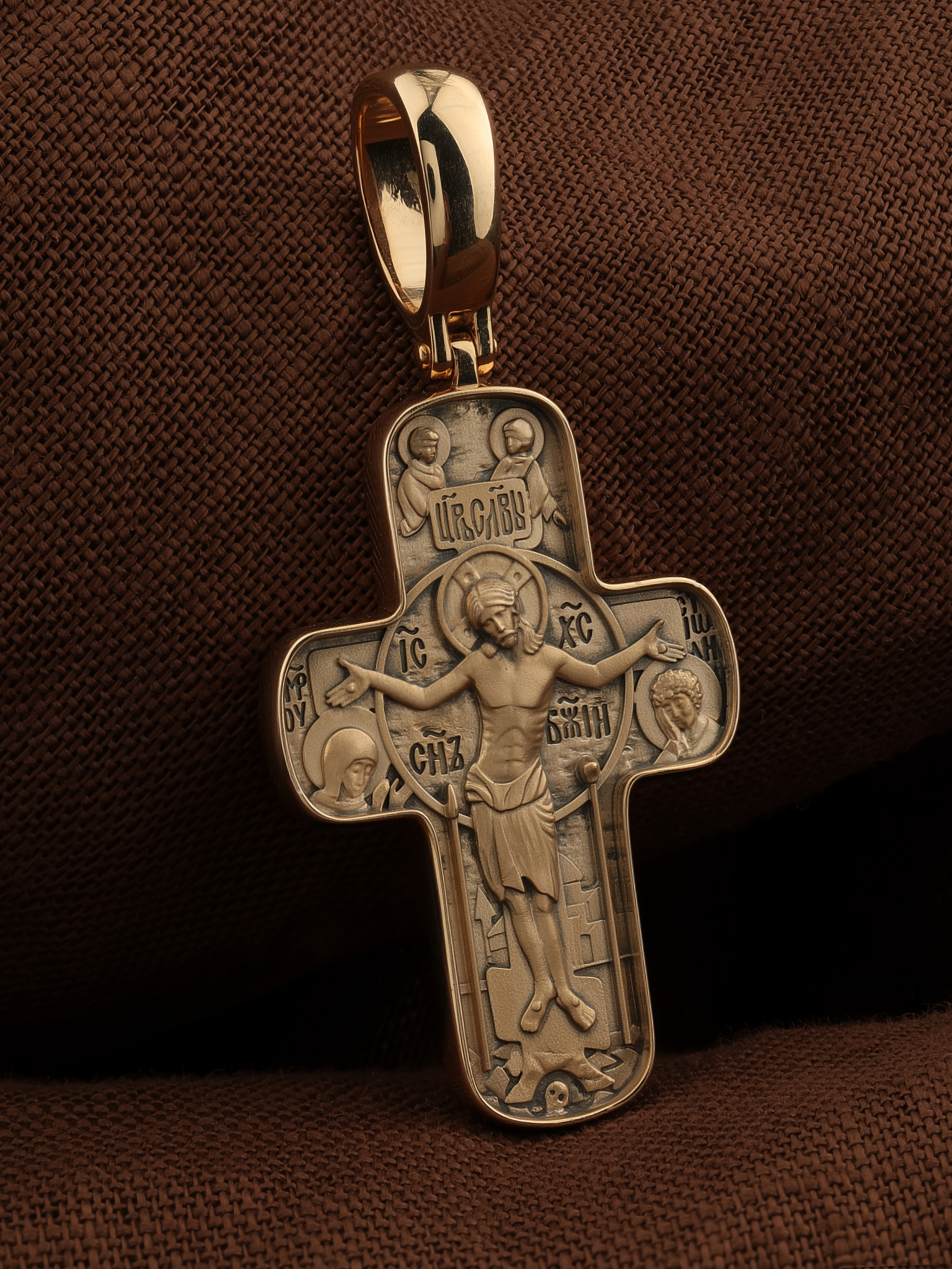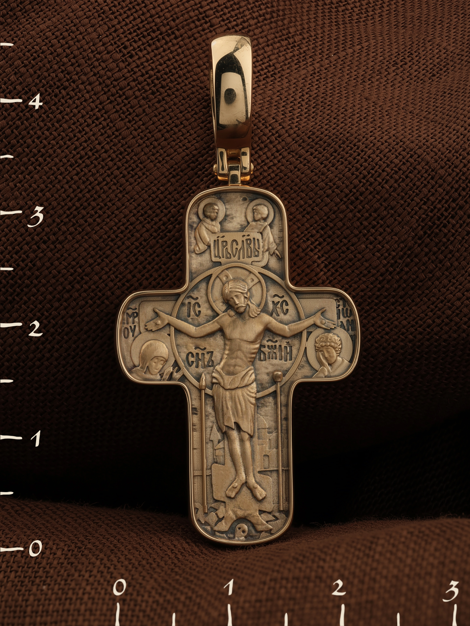 На лицевой стороне креста изображено Распятие Господа и Спасителя нашего Иисуса Христа. Христос, подвергнутый на кресте мучительной казни, своими страданиями искупил нас от древнего греха и даровал нам жизнь вечную. Без Распятия не было бы Воскресения Христова, и поэтому Крест из орудия казни обратился в святыню, в которой действует Благодать Божия. Над Распятием помещена надпись «Царь Славы». Распятие сопровождается надписями, олицетворяющими Христа: «IС» « ХС», что означает Иисус Христос и «Сын Божий». Над вершиной Распятия помещены изображения Ангелов.. Слева от Распятия изображена Пресвятая Богородица, справа — апостол и евангелист Иоанн Богослов, один из ближайших учеников Иисуса Христа. Возвышение, на котором стоит Крест, символизирует гору Голгофу, на которой произошло Распятие. Под подножием Креста изображена покоящаяся голова (череп) Адама