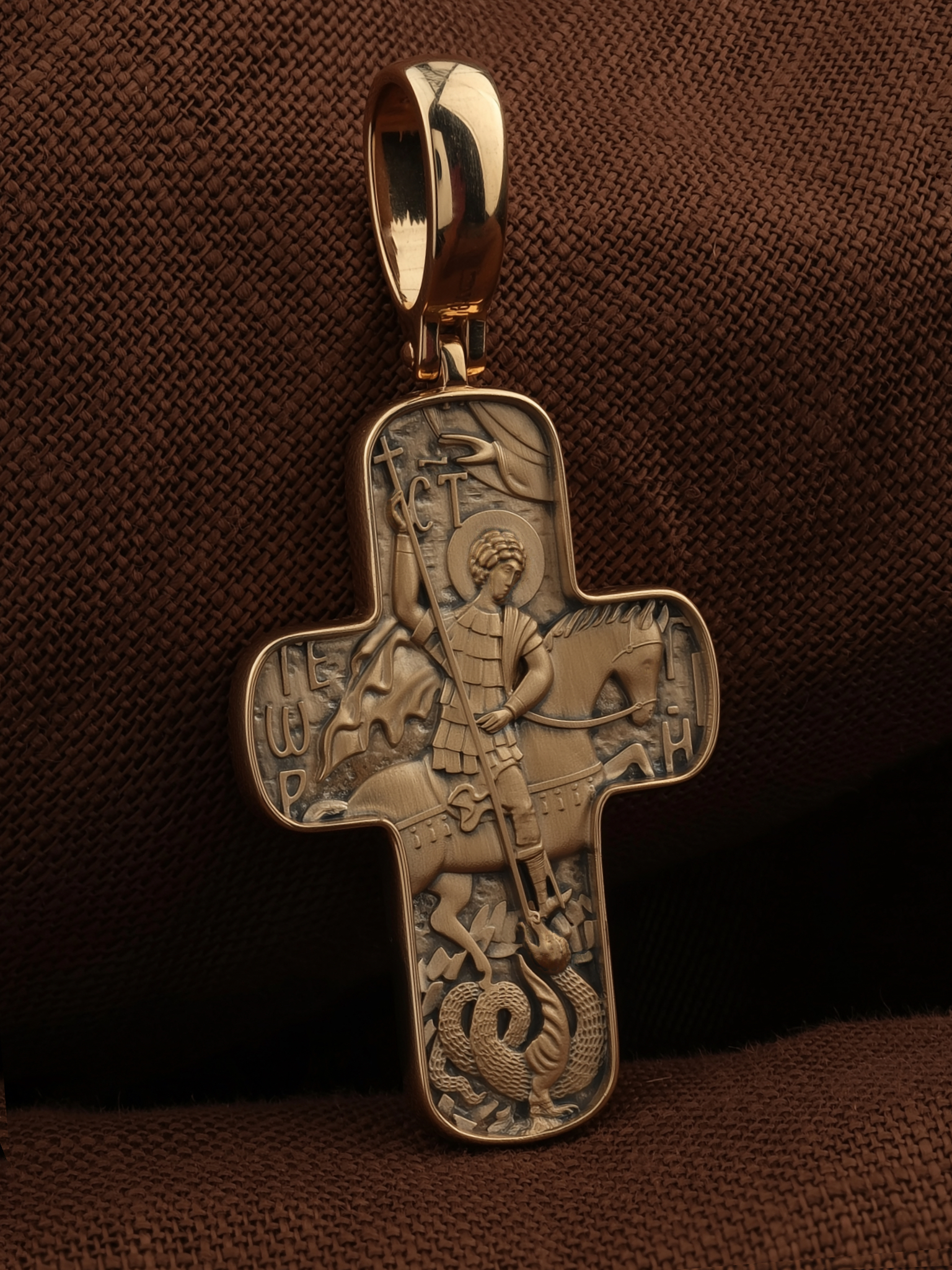 Основой композиции оборотной стороны креста является изображение Святого Великомученика Георгия Победоносца — одного из самых почитаемых и удивительных святых. На Руси он известен как Юрий или Егорий, покровитель воинов, помощник в крестьянском труде. На образке он изображен как воитель, сидящий на коне и поражающий копьем огнедышащего змея. Змей символизирует собою сатанинские силы. Молитвами вознесенными к Всевышнему и своей непреклонной верой он смог одолеть чудовище.. Над образом изображена благословляющая Божия десница.