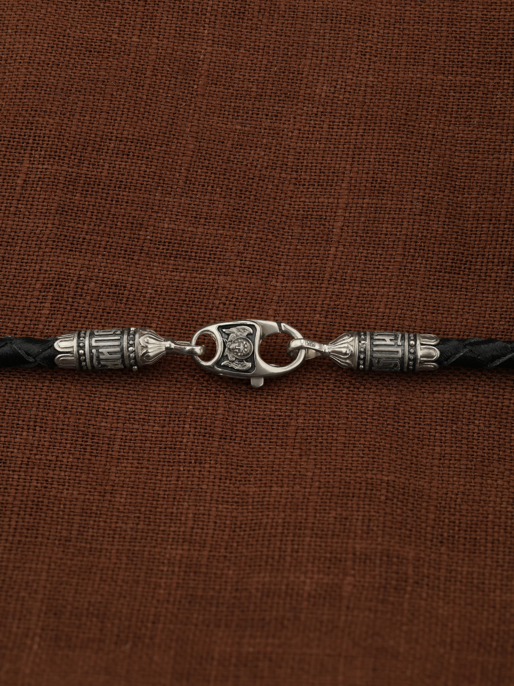 На шнурке цепи-шнурка расположены вставки, а на концах концевики с надписью: «Спаси и сохрани». Соединяет концевики замочек-карабин в форме рыбки. На замочке изображен шестикрылый Серафим.