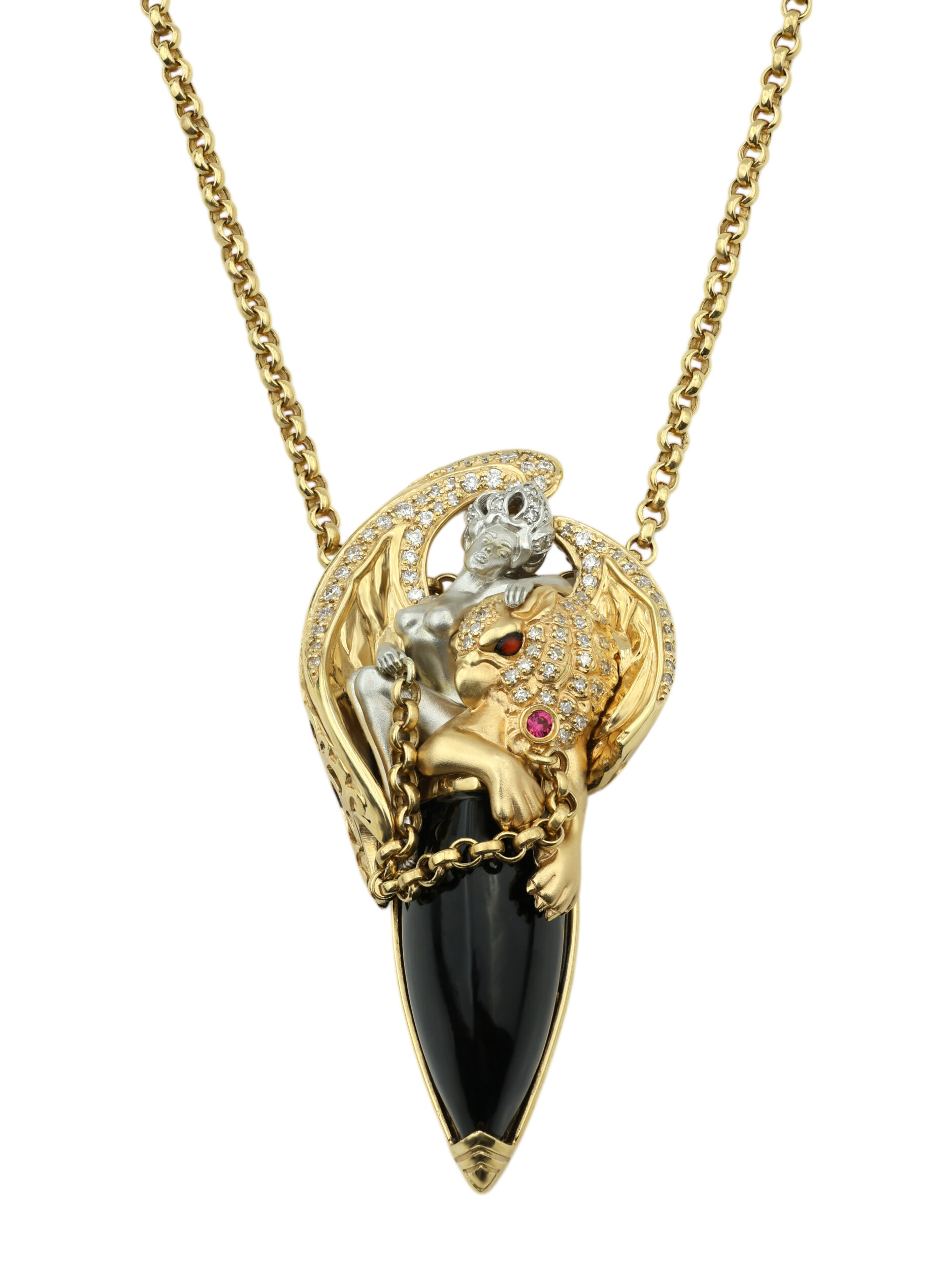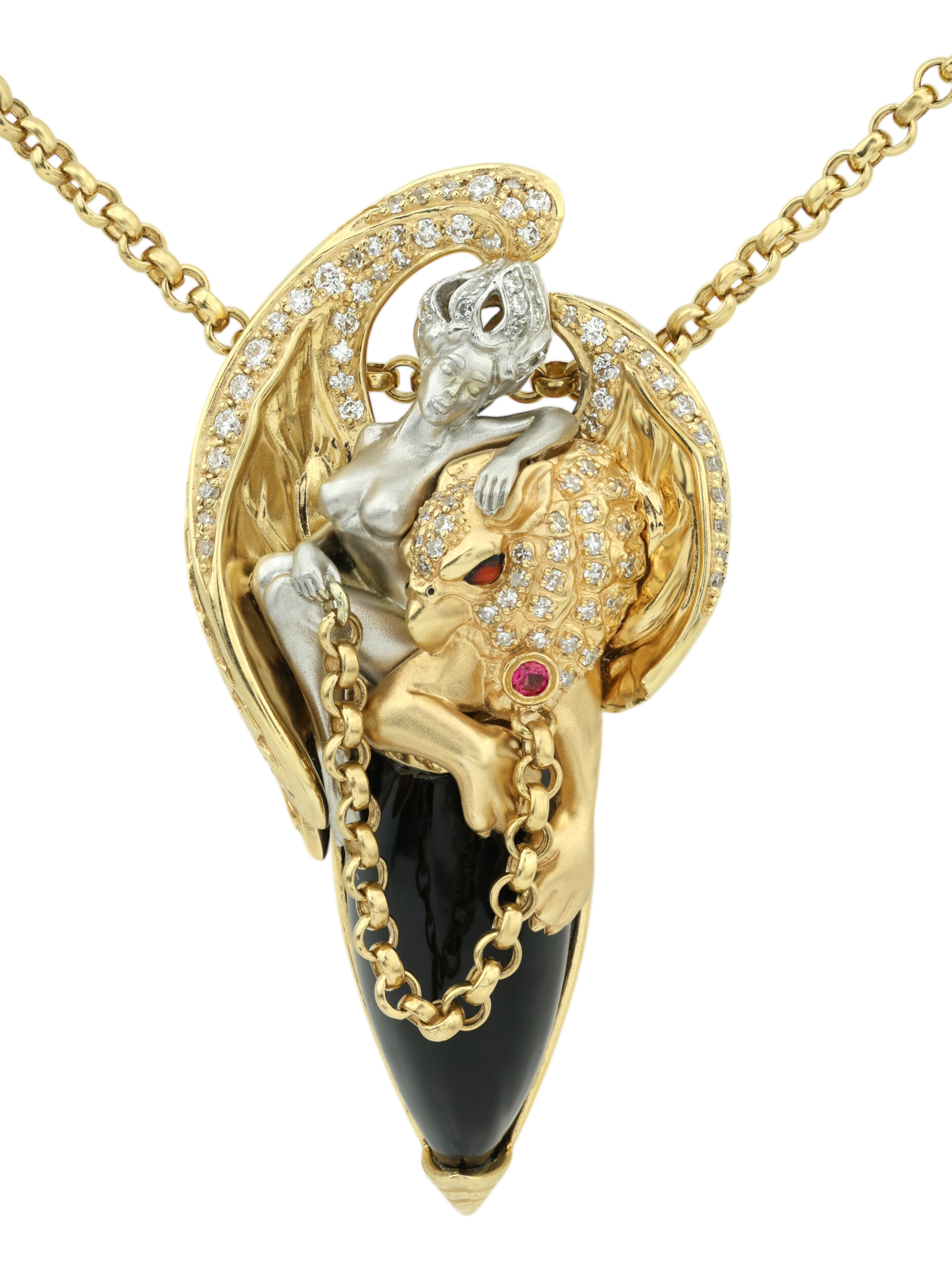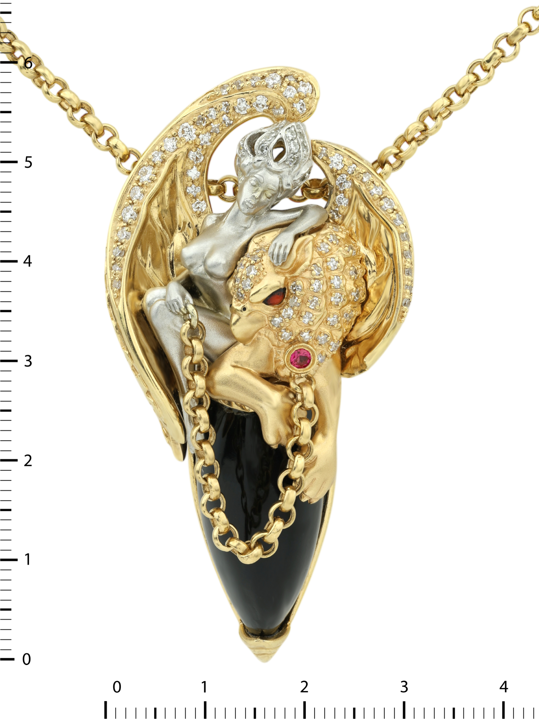 Колье из лимонного золота 585 пробы c эмалью, бриллиантами, рубином, ониксом и рубином