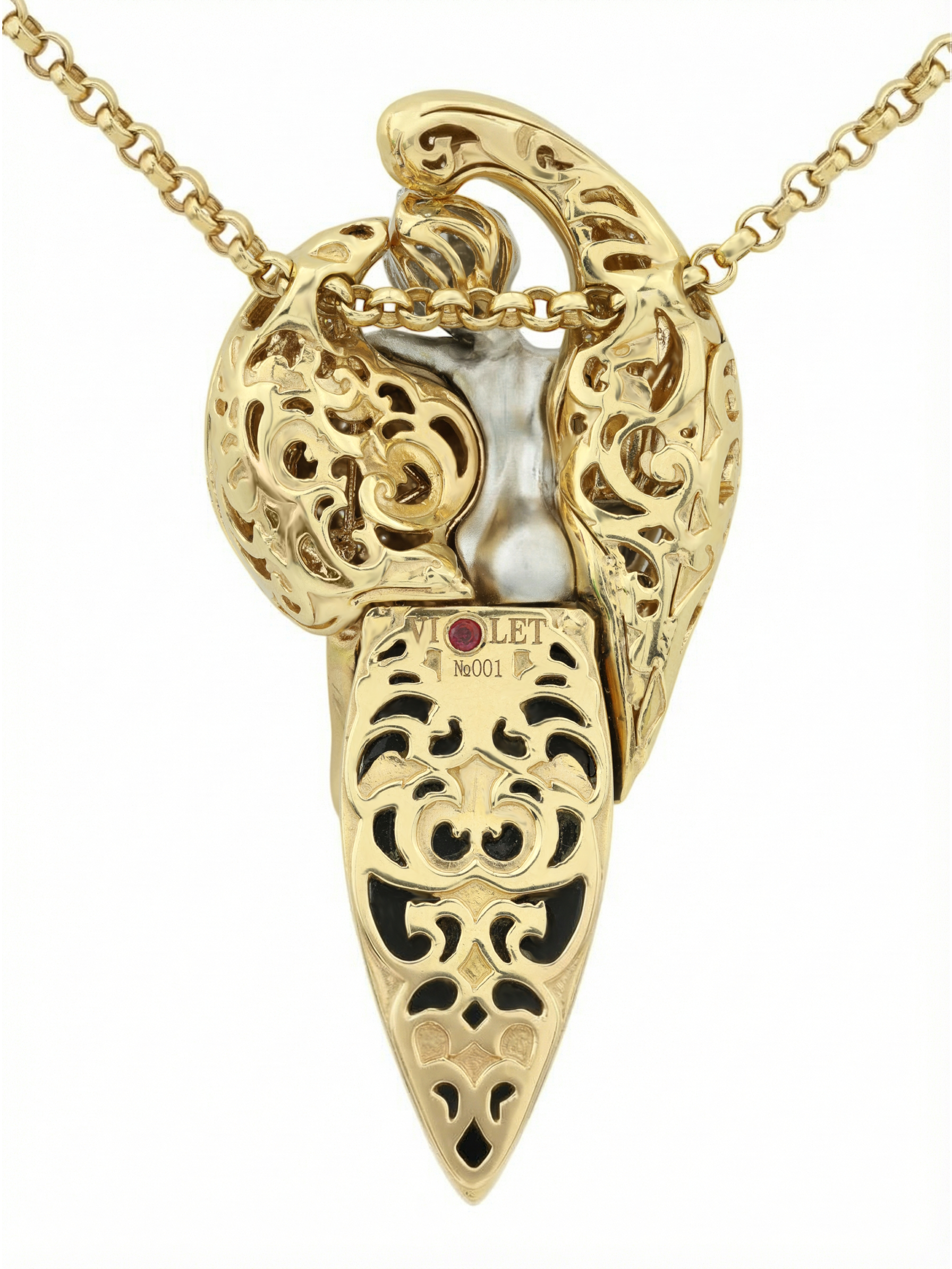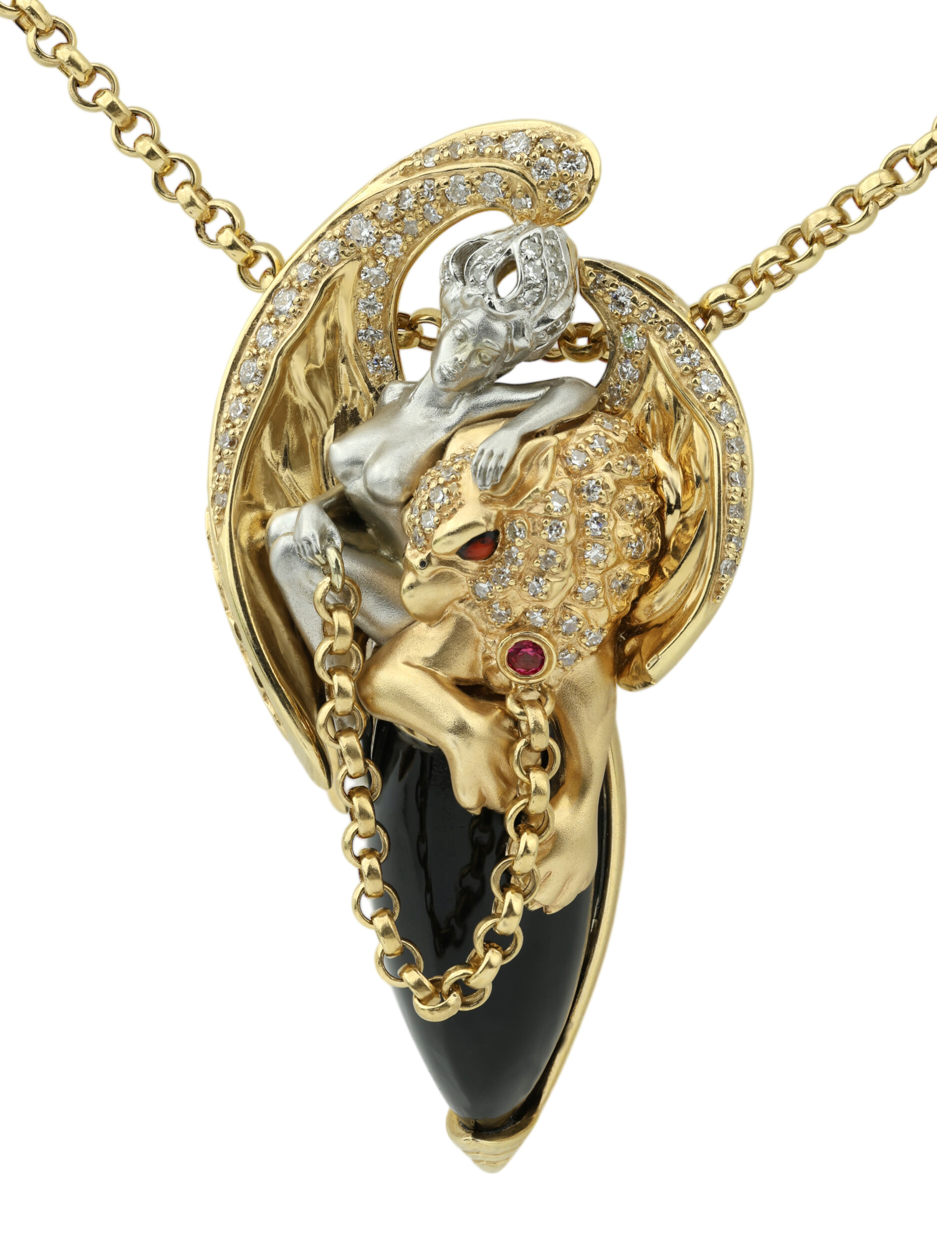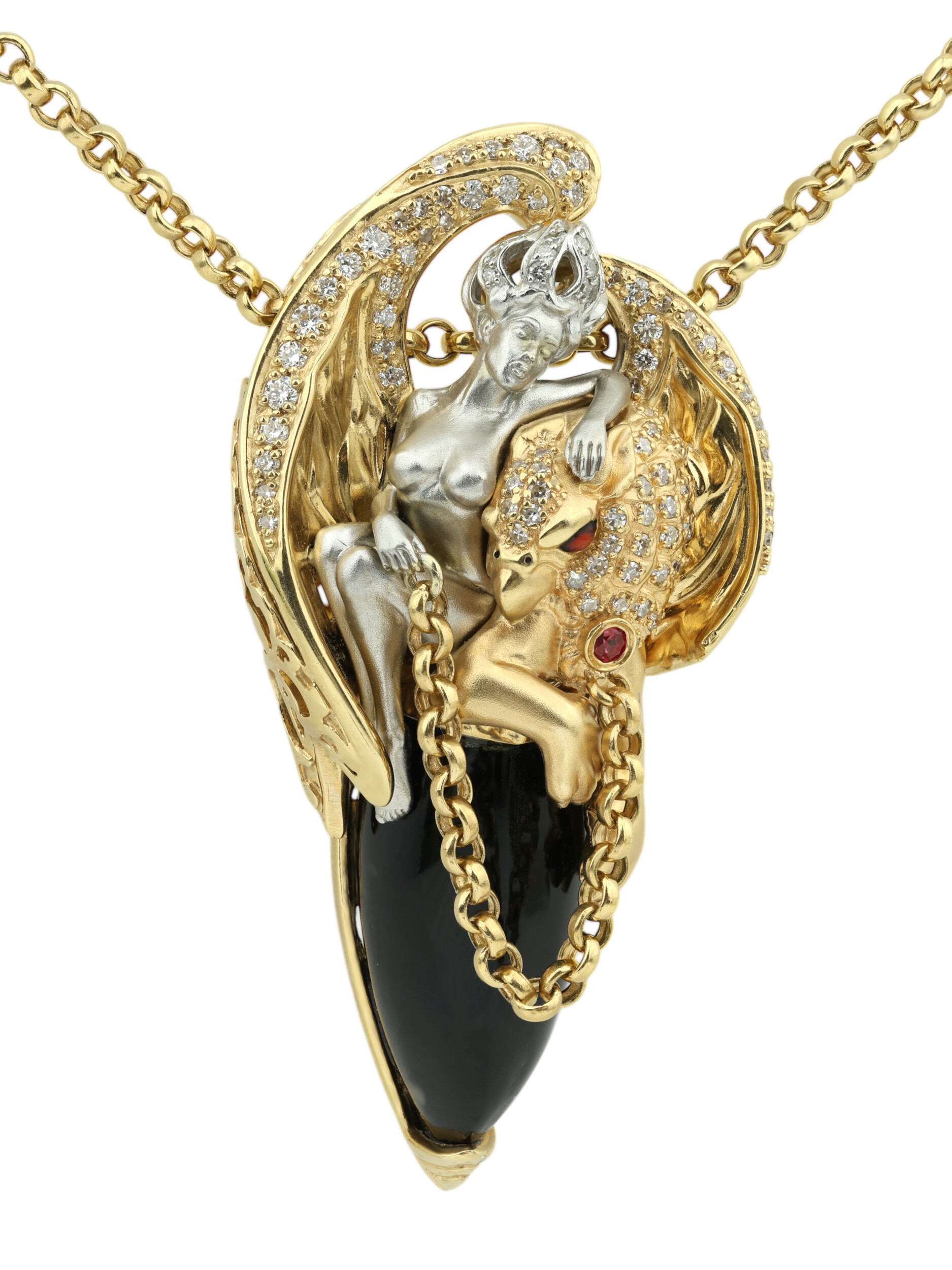 Колье из лимонного золота 585 пробы c эмалью, бриллиантами, рубином, ониксом и рубином