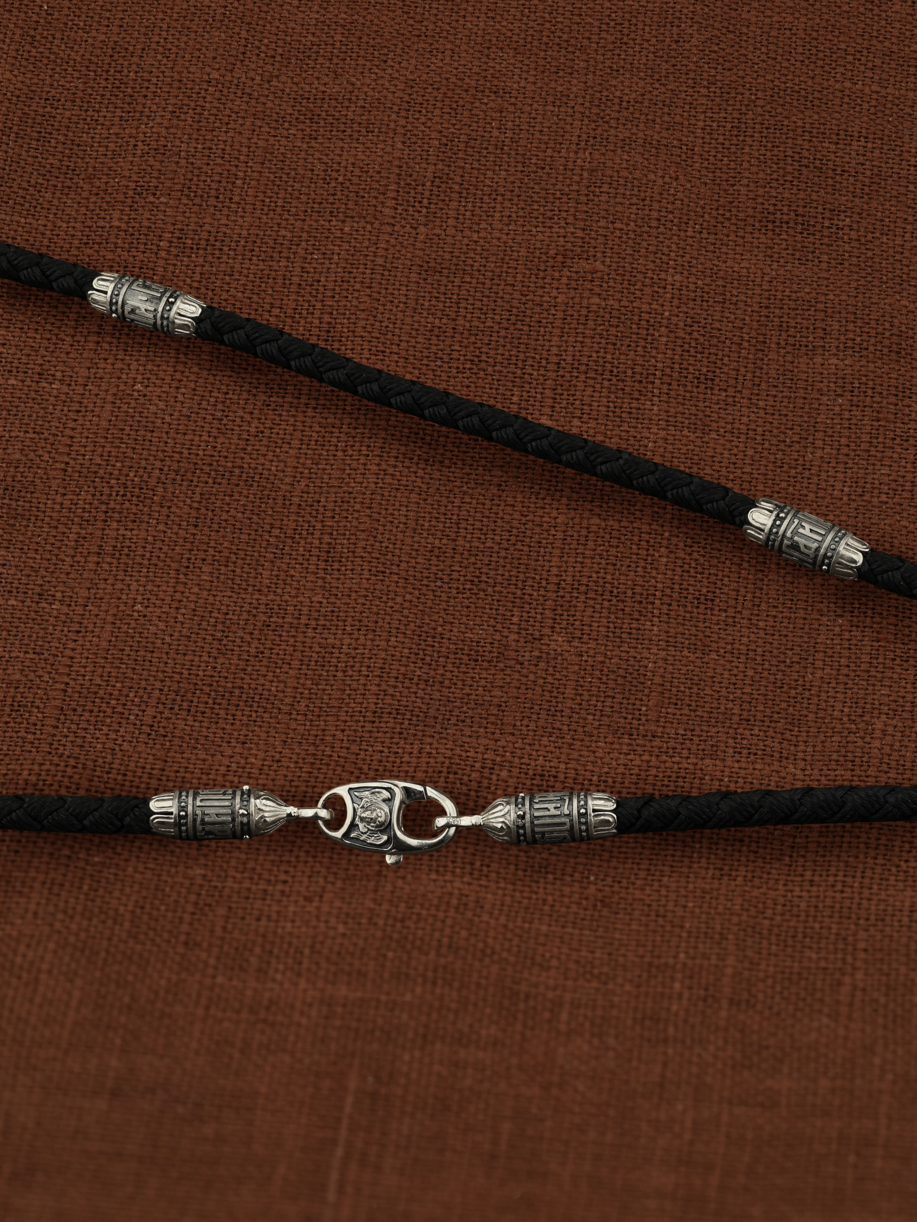На шнурке цепи-шнурка расположены вставки, а на концах концевики с надписью: «Спаси и сохрани». Соединяет концевики замочек-карабин в форме рыбки. На замочке изображен шестикрылый Серафим.