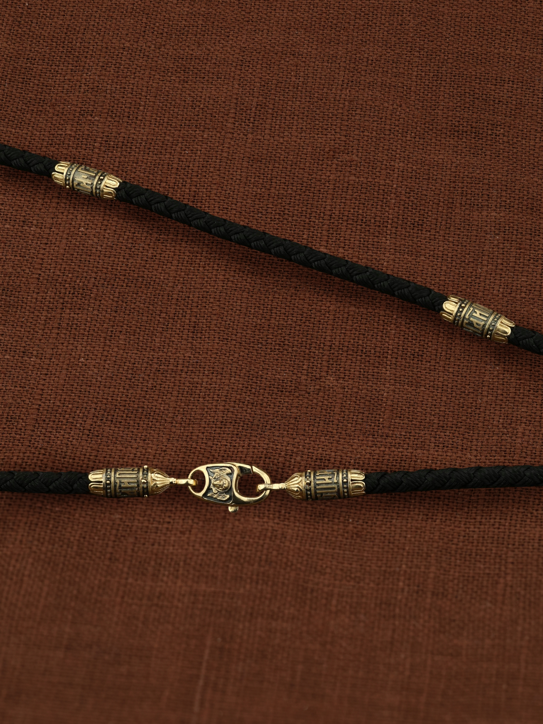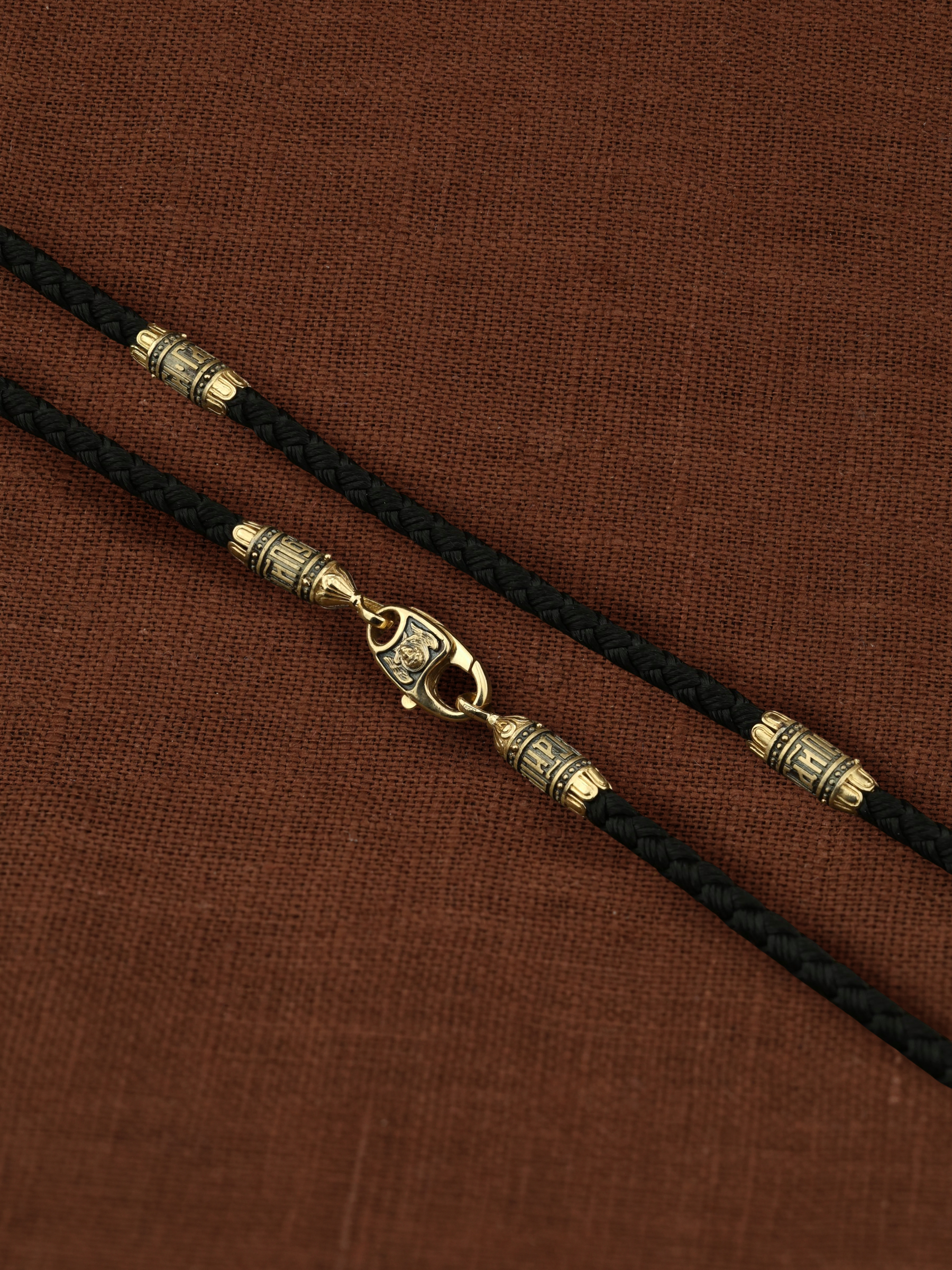 На шнурке цепи-шнурка расположены вставки, а на концах концевики с надписью: «Спаси и сохрани». Соединяет концевики замочек-карабин в форме рыбки. На замочке изображен шестикрылый Серафим.