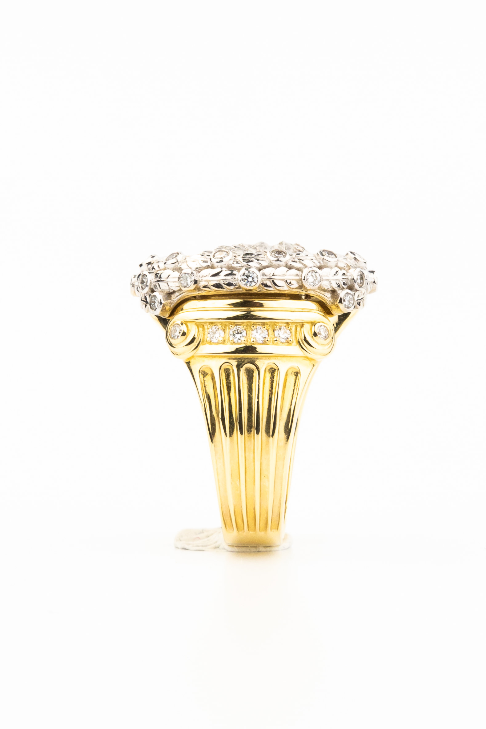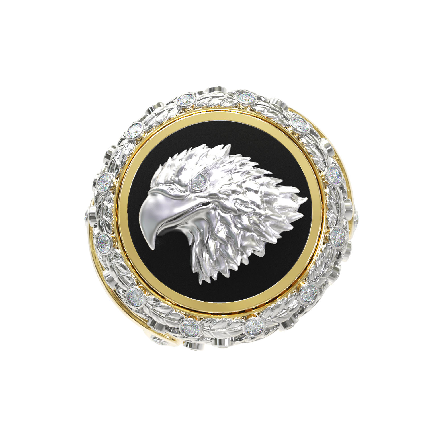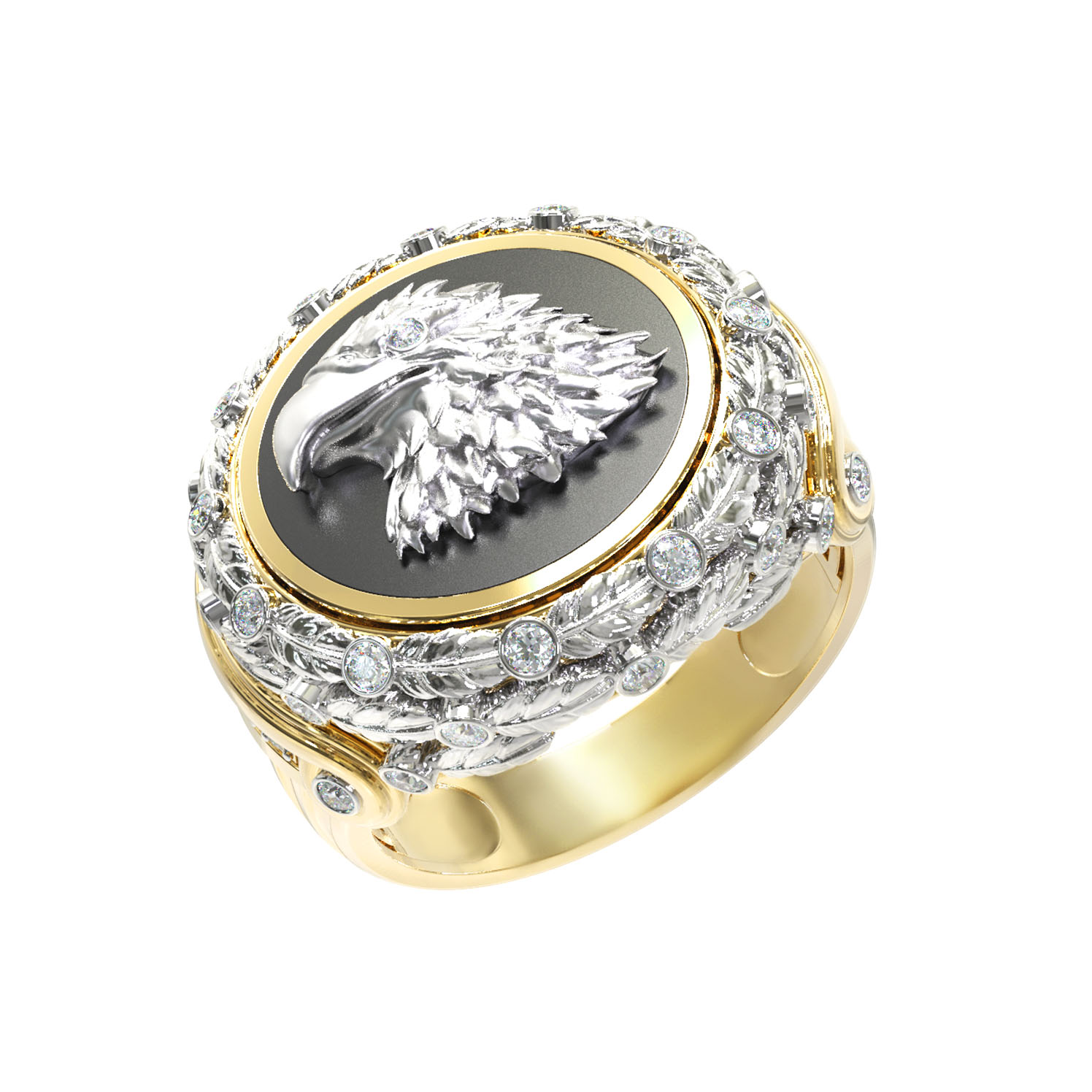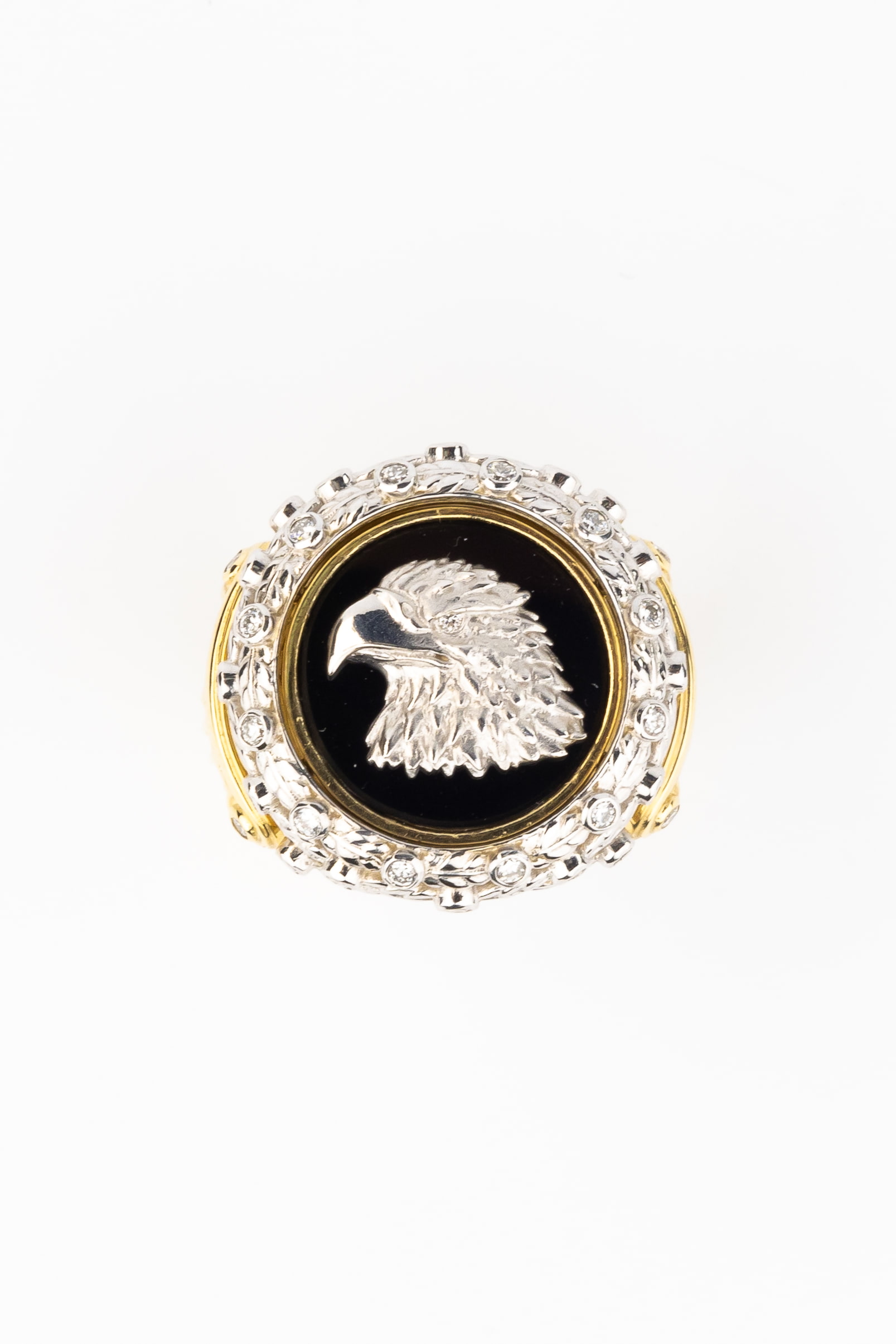 Контрастное сочетание материалов придает украшению особую глубину: насыщенный черный оникс служит эффектным фоном для фигуры птицы, создавая неповторимую игру цвета. Оформление дополнено 42 сверкающими бриллиантами круглой огранки белого цвета, которые изящно обрамляют композицию, подчеркивая блеск и сияние лимонного золота. Тщательная проработка деталей делает это кольцо настоящим произведением ювелирного искусства.