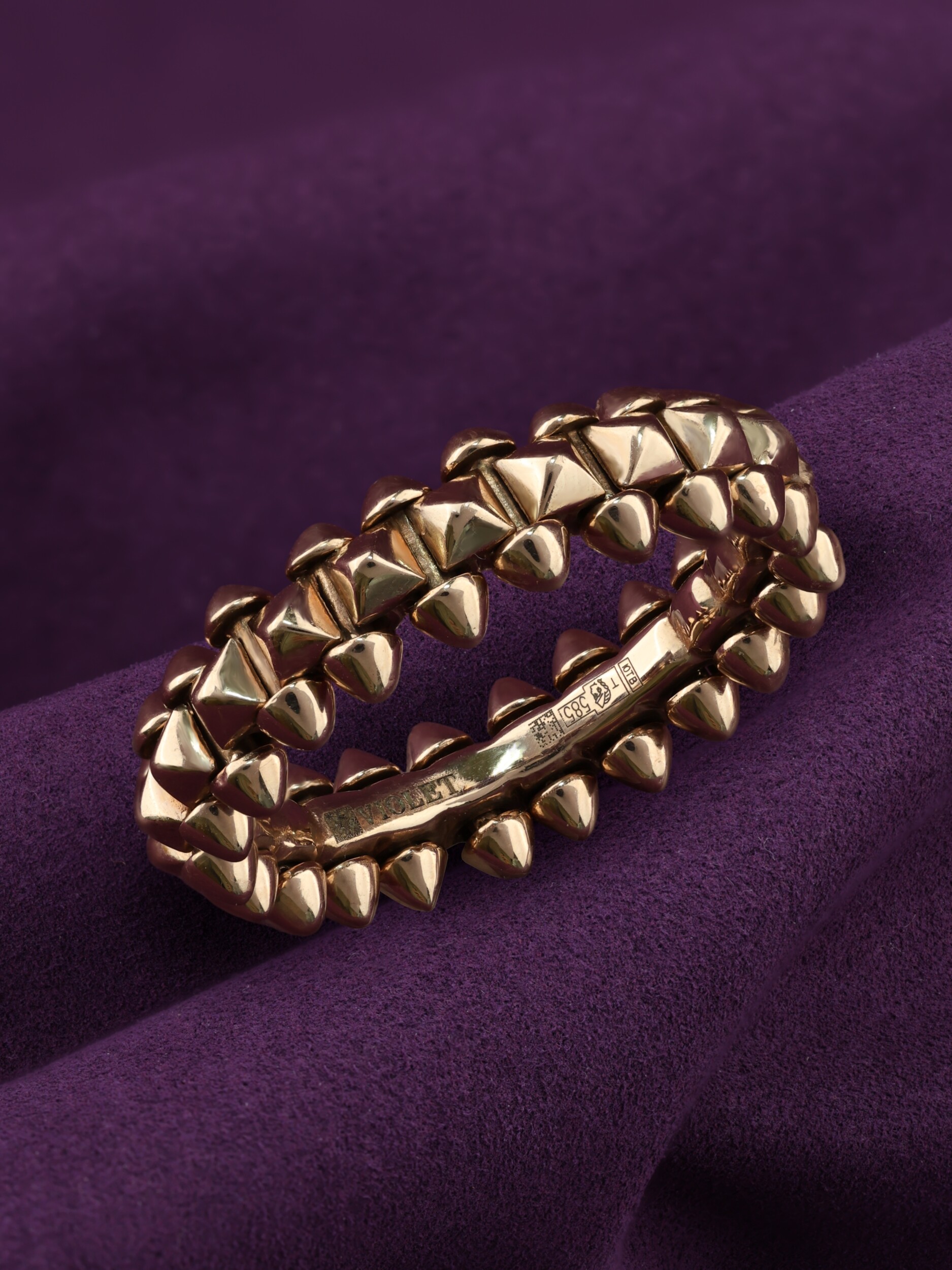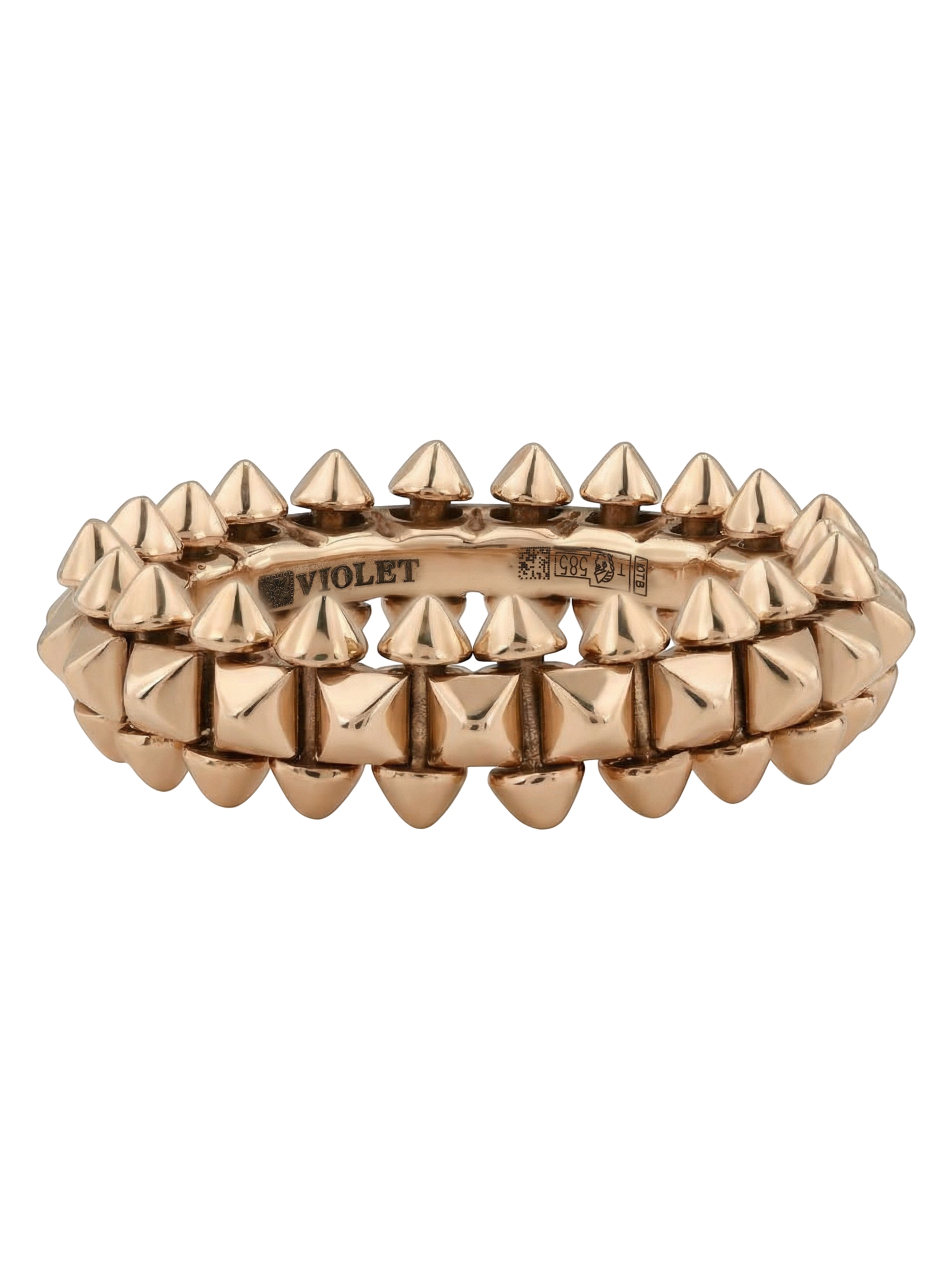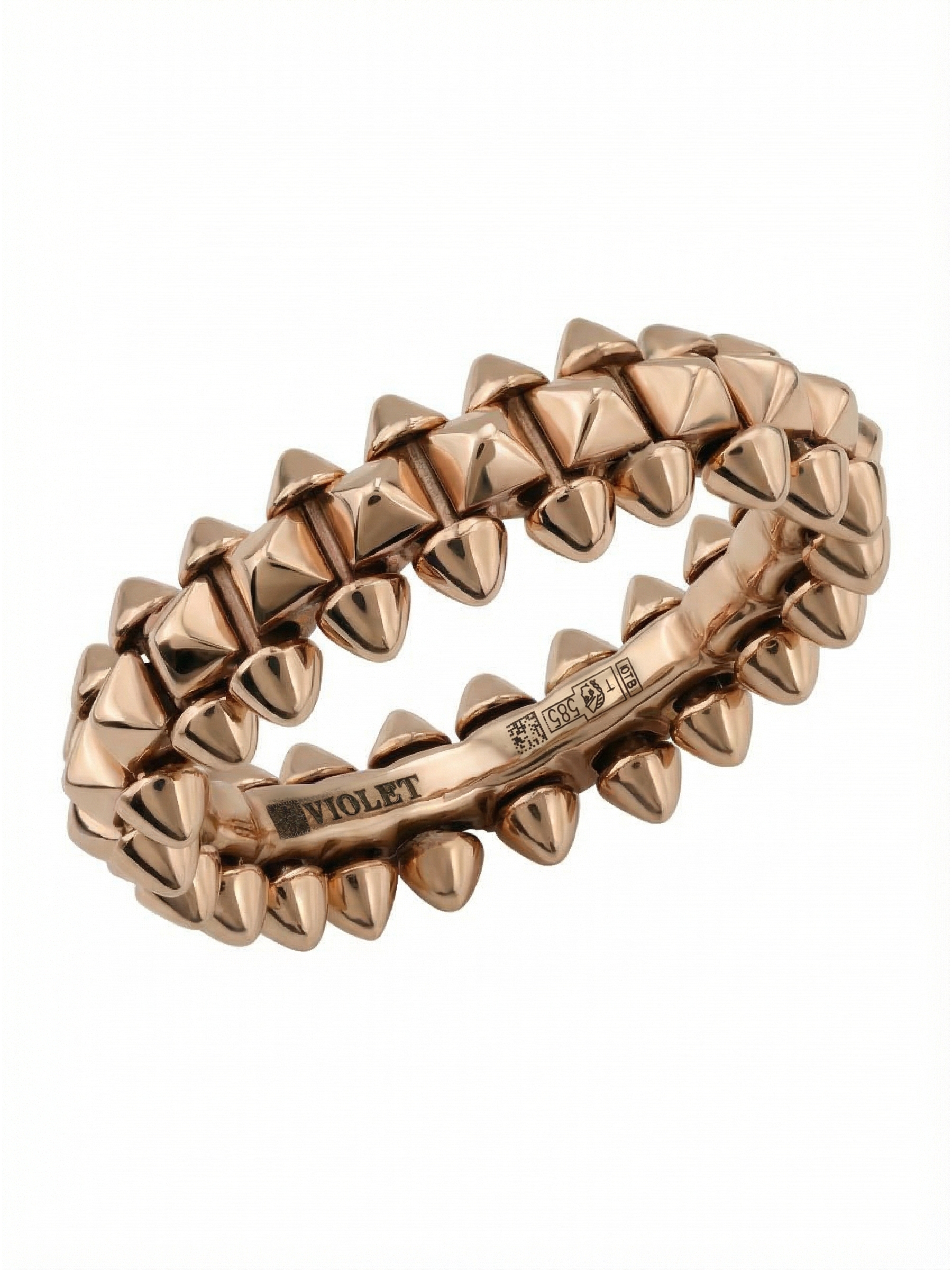 Украшение выполнено из качественного розового золота 585 пробы. Мягкий оттенок металла в сочетании с агрессивной геометрией шипов создает гармоничный контраст, который выглядит стильно и современно. Это унисекс-кольцо одинаково хорошо подходит как для женщин, так и для мужчин, позволяя создавать запоминающиеся аутфиты или использовать его как элемент парных украшений. Данная модель может стать частью изысканного комплекта, который дополнит вашу шкатулку.
