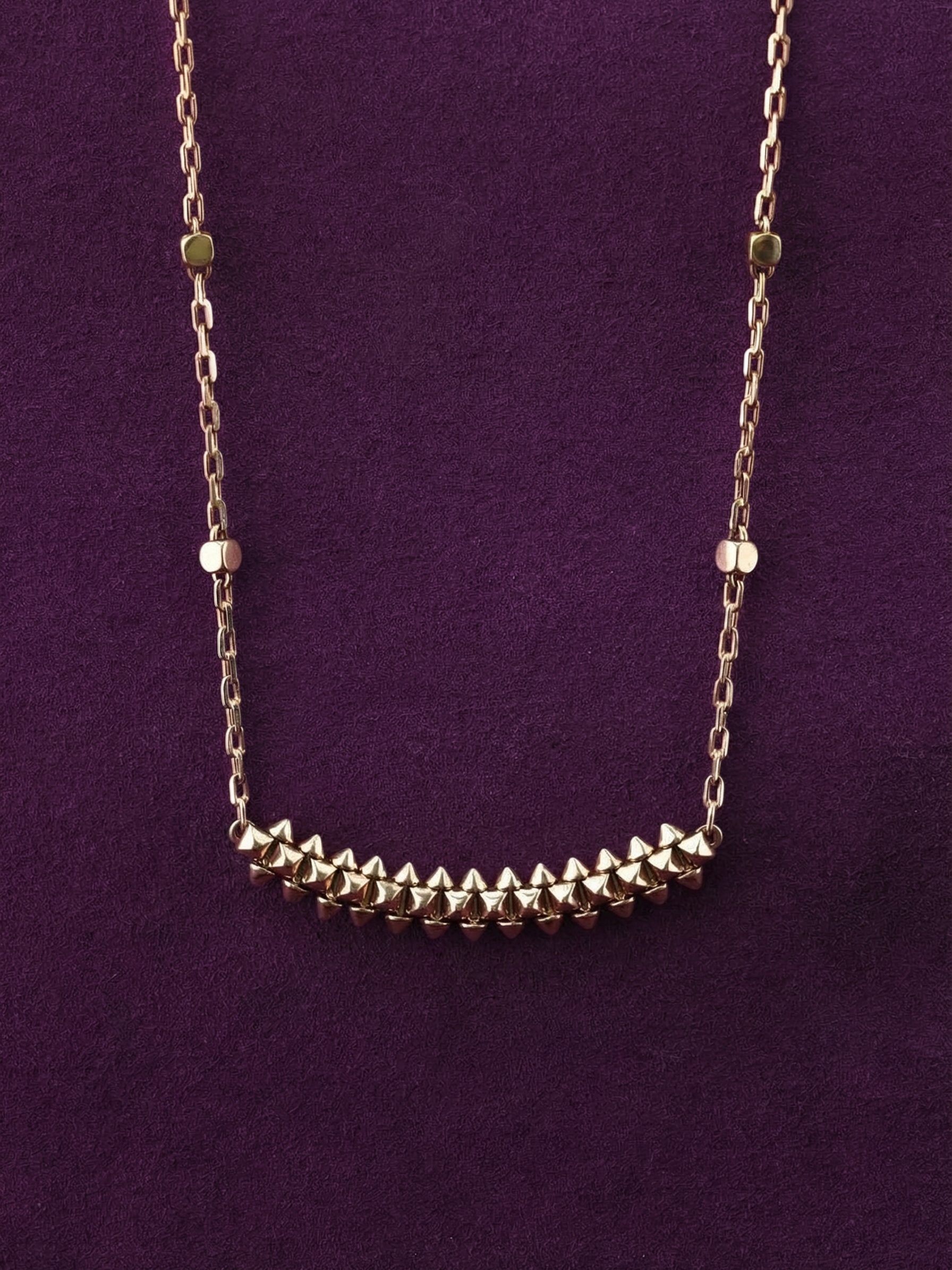 Данная модель выполнена в нежном розовом цвете металла, что придает строгому дизайну мягкости и благородства. Колье универсально и подходит как для женщин, так и для мужчин, подчеркивая индивидуальность владельца. Тонкая, но прочная цепочка гармонично дополняет массивную центральную часть с шипами, создавая сбалансированную композицию. Доступны варианты с длиной 40 и 45 см, что позволяет подобрать идеальную посадку.