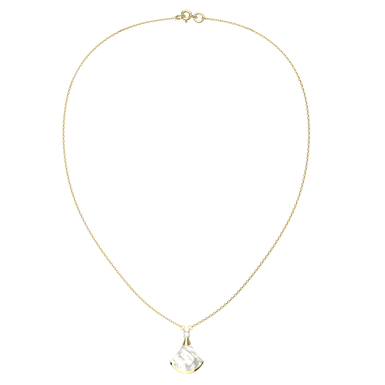 Элегантное колье из лимонного золота 585 пробы — воплощение утонченности и высокого ювелирного искусства. Центральным элементом украшения выступает изысканная подвеска в форме веера, дизайн которой вдохновлен эстетикой коллекции De Luxe — Веер. Нежный перелив перламутра, обладающего глубоким белым цветом, гармонично сочетается с теплым сиянием лимонного золота, создавая притягательный образ.