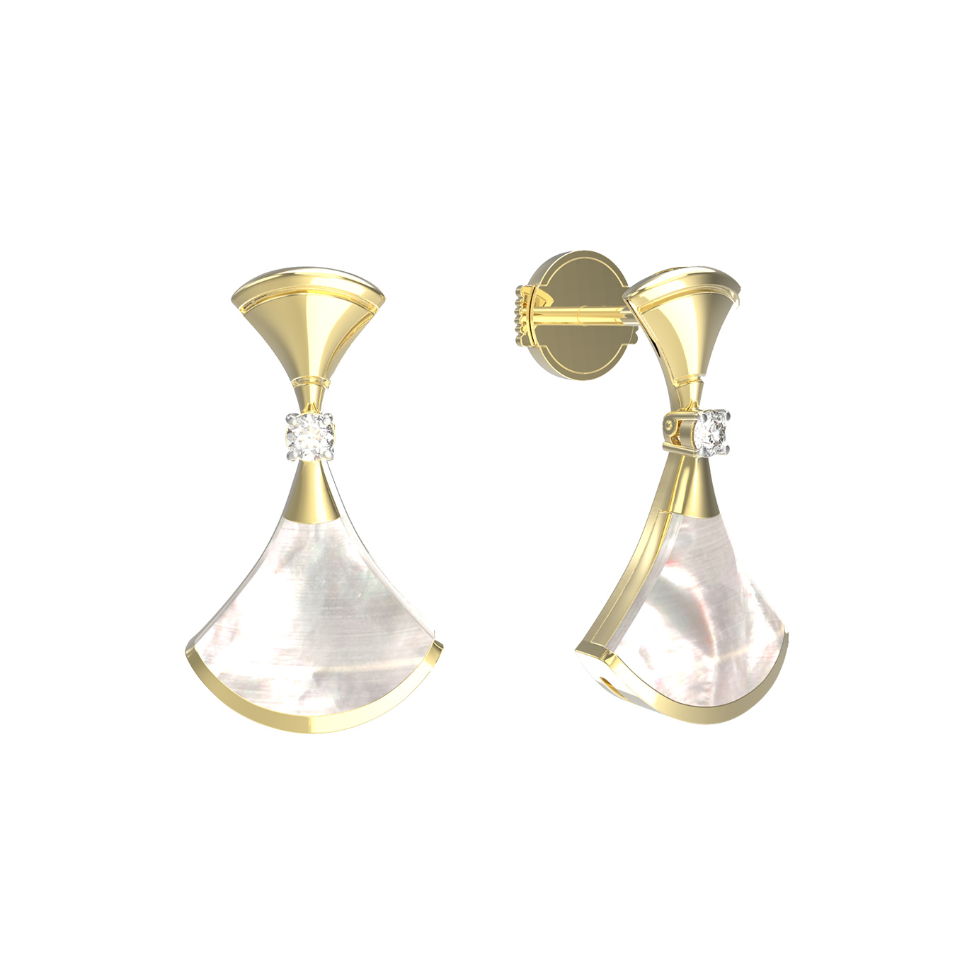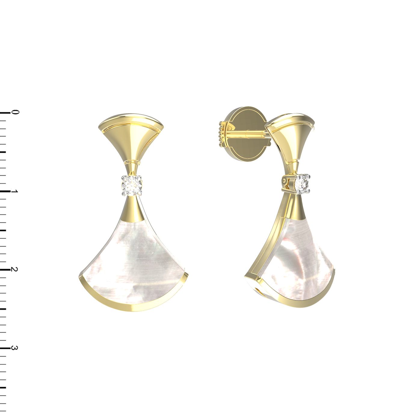 Центральным элементом композиции выступают два сияющих бриллианта круглой формы, расположенные над изящными вставками из перламутра. Белый блеск драгоценных камней эффектно контрастирует с нежным переливом перламутра, создавая завораживающую игру света при каждом вашем движении. Геометрически выверенные линии веера придают изделию современный и одновременно классический вид.